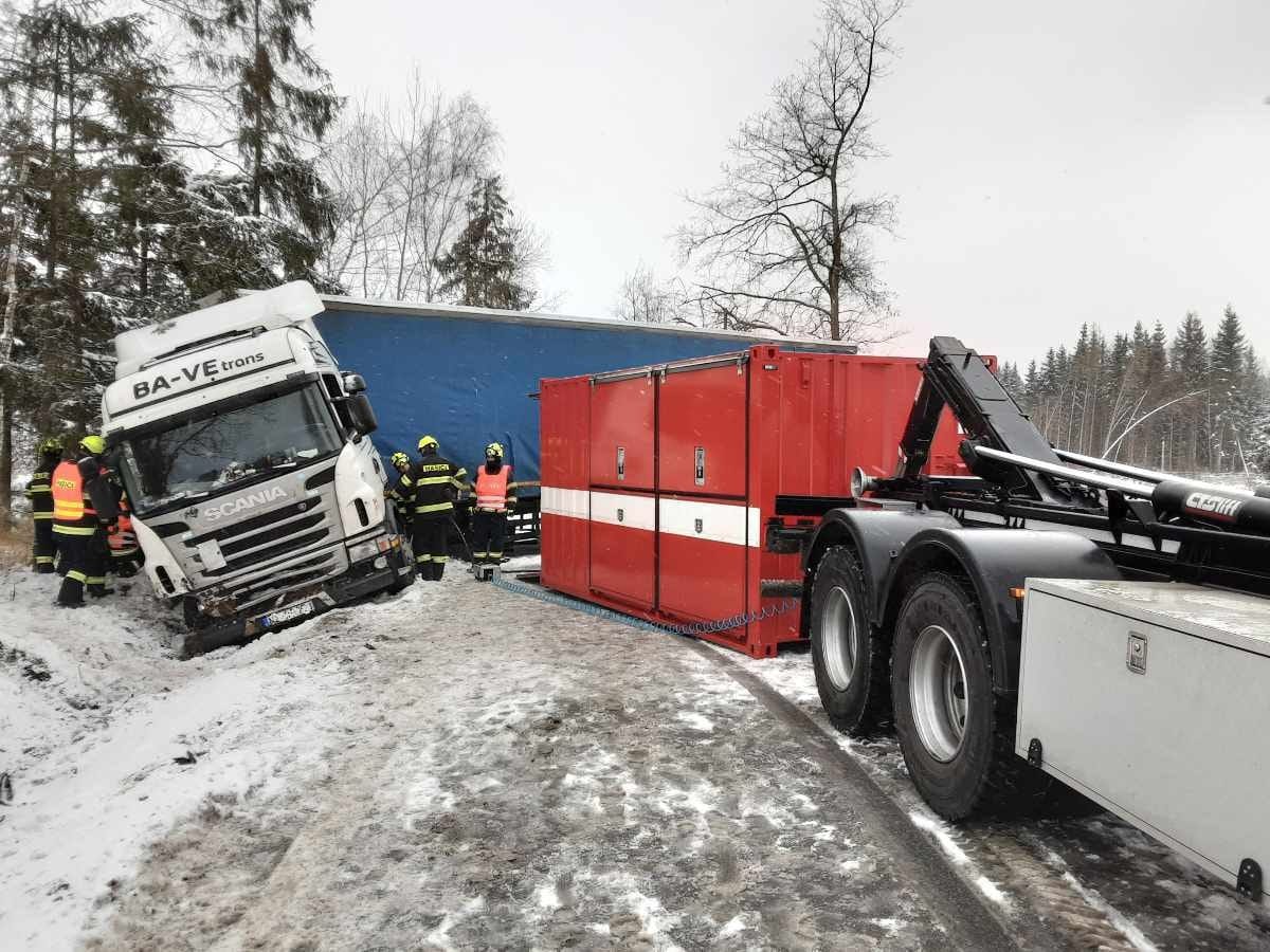 Některé komunikace blokují i uvízlé kamiony. Odstavené nákladní vozidlo s přívěsem hlásí řidiči mezi Cikhájí a Světnovem, další kamion stojí u obce Černá na Žďársku.