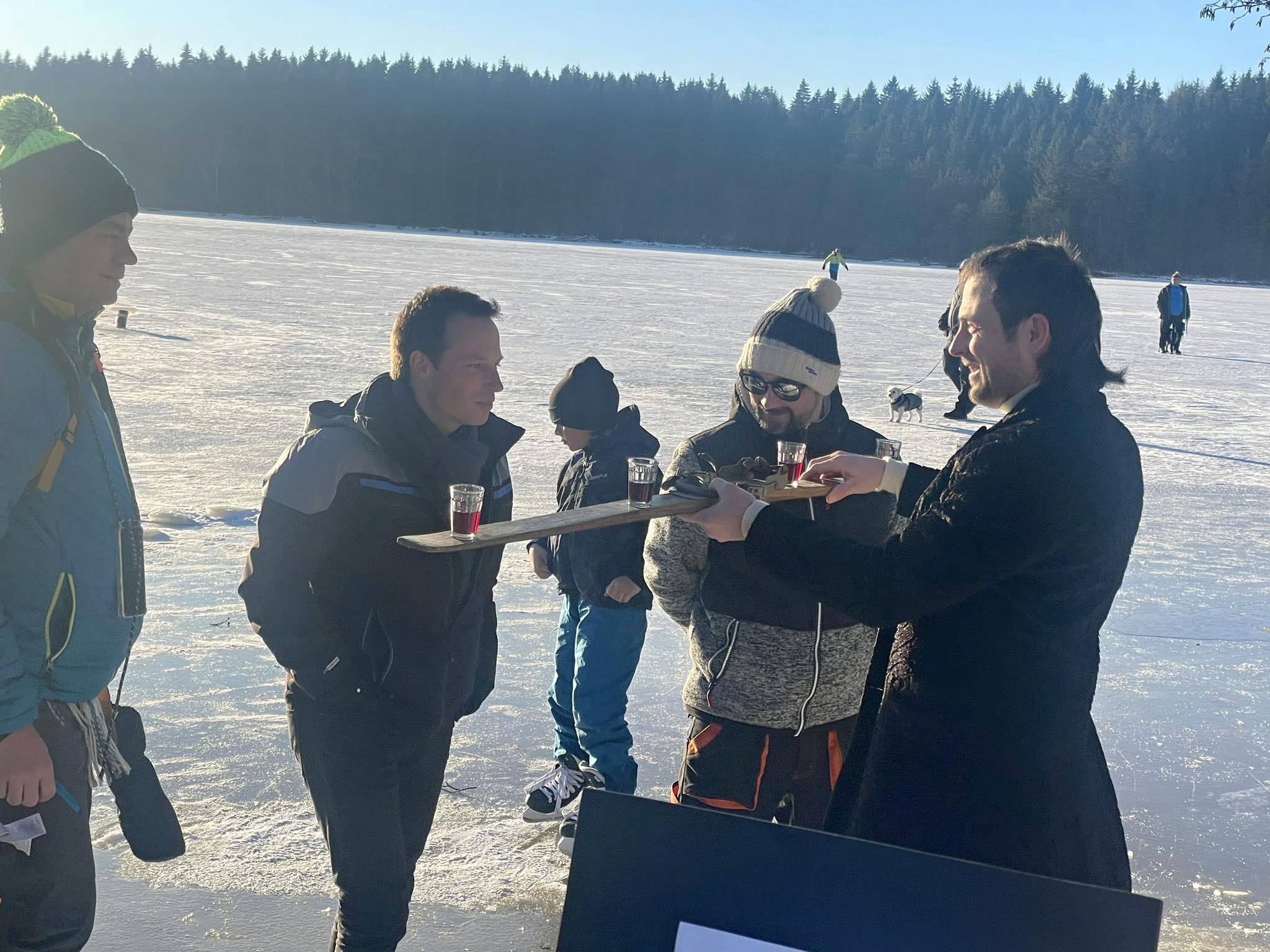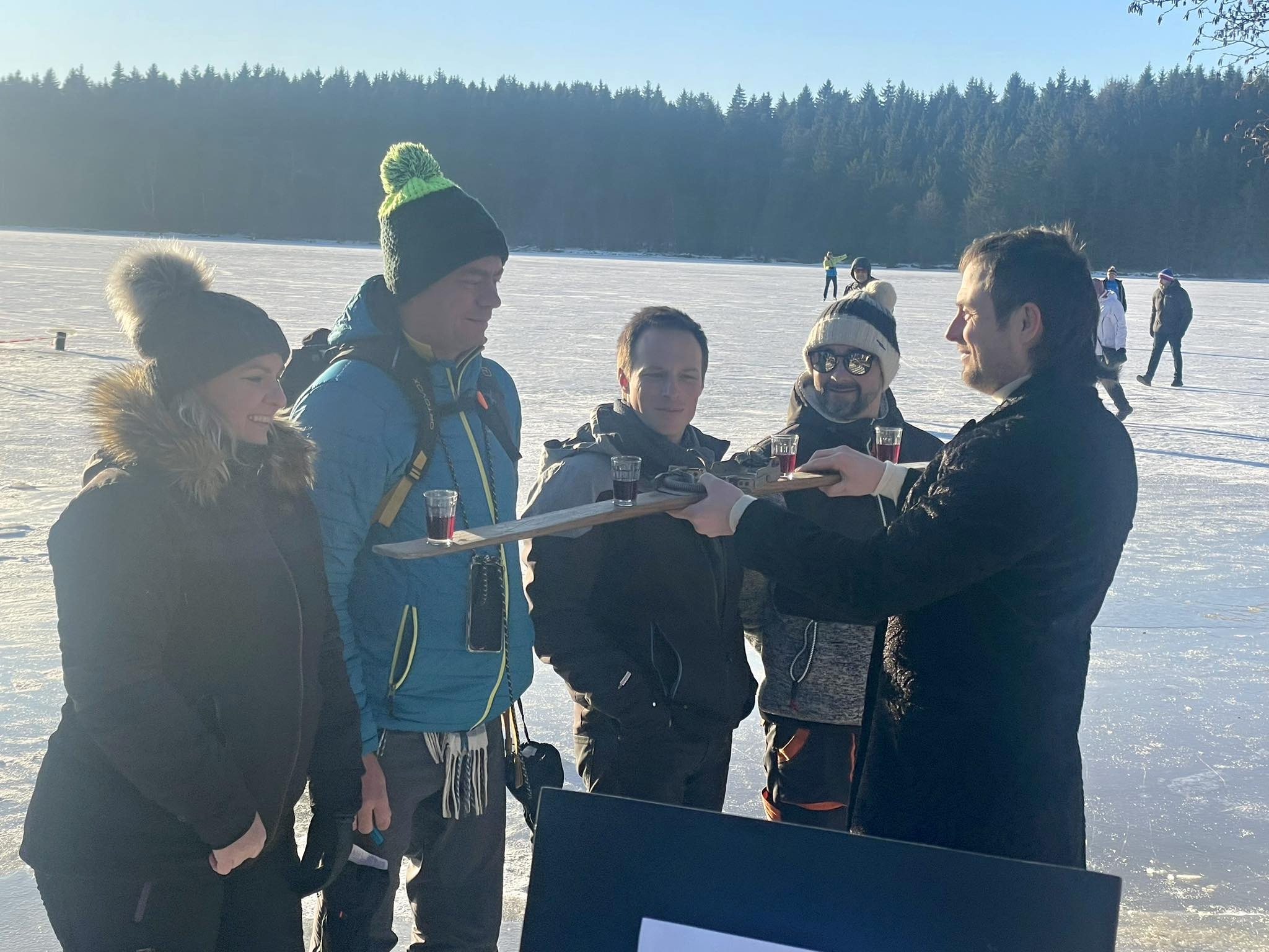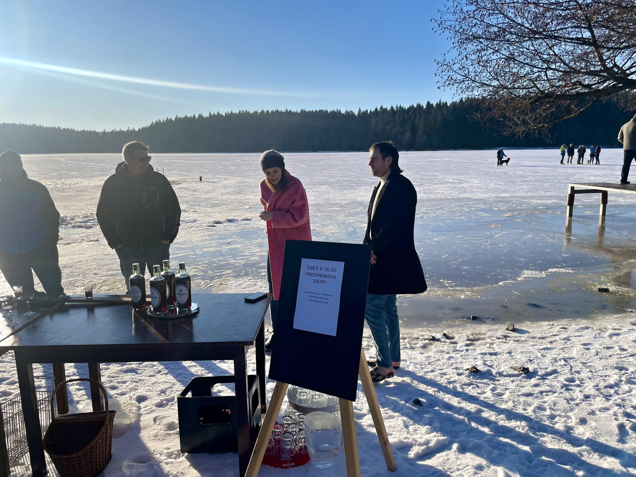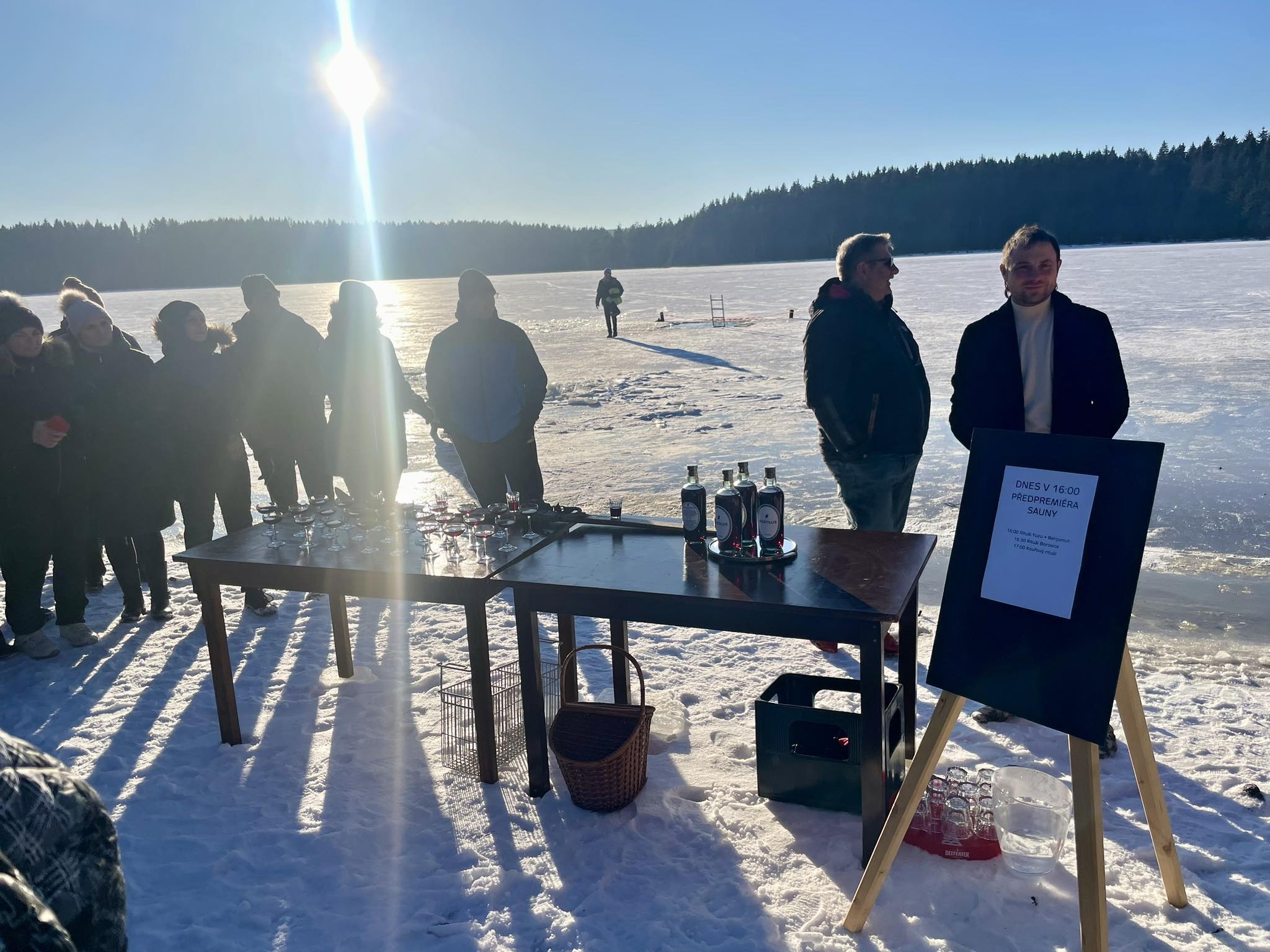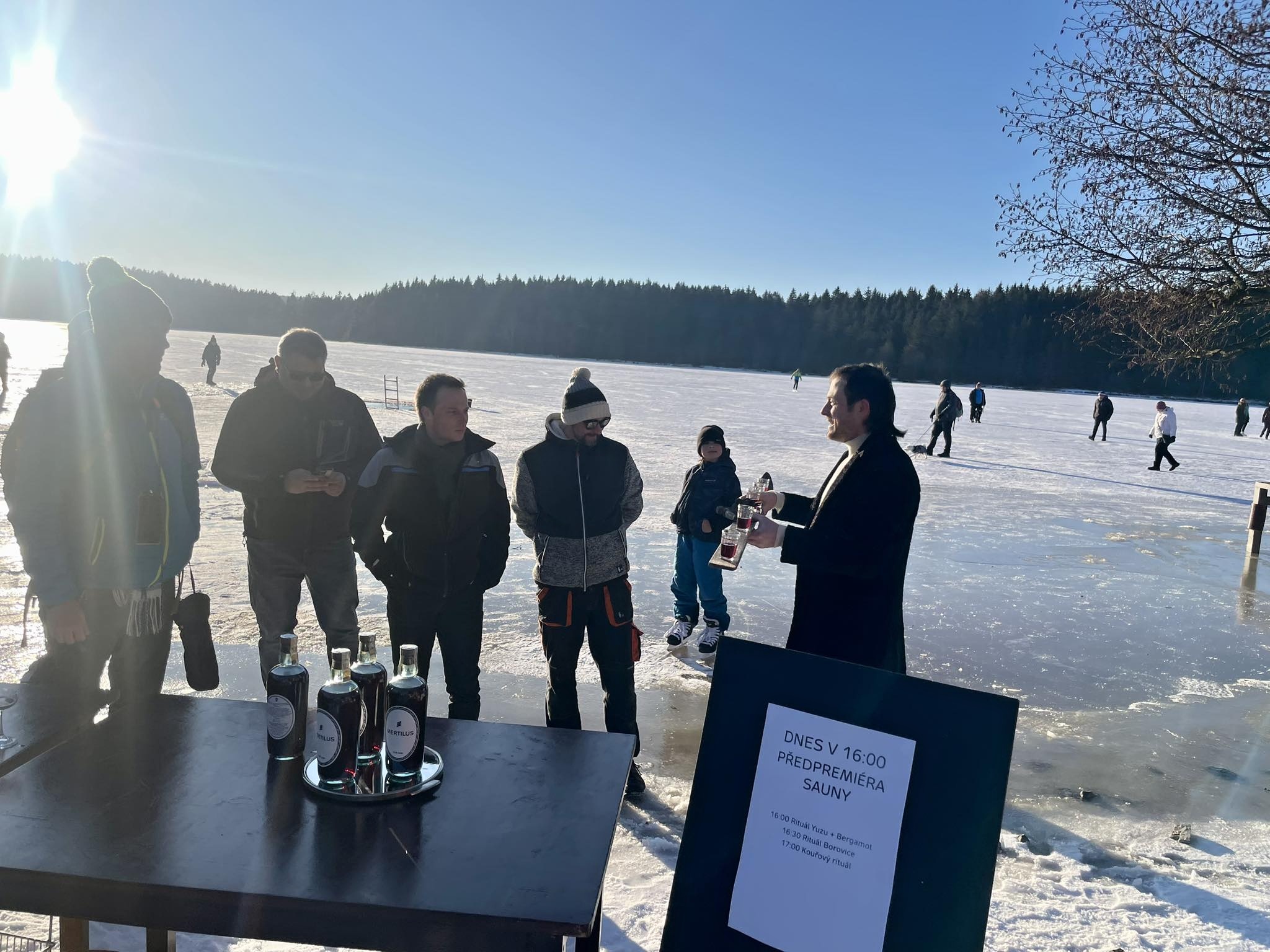 Přestože do ledové vody vlezlo jen pár nadšenců, novinkou, kterou byl nový borůvkový likér Mertilus, nepohrdl nikdo. Slavnostní degustaci stejně jako koupací akci pro návštěvníky připravil Hotel Medlov.