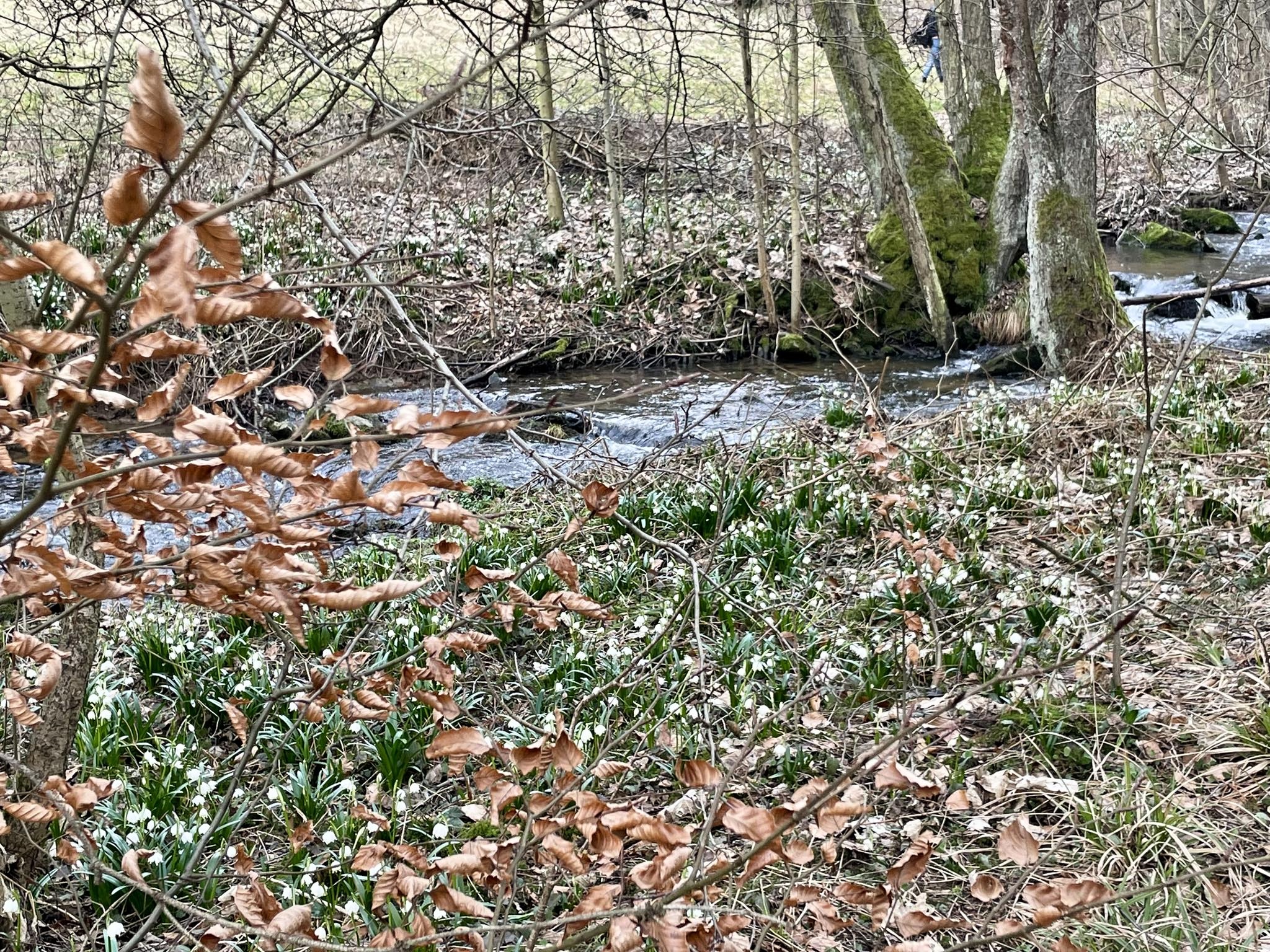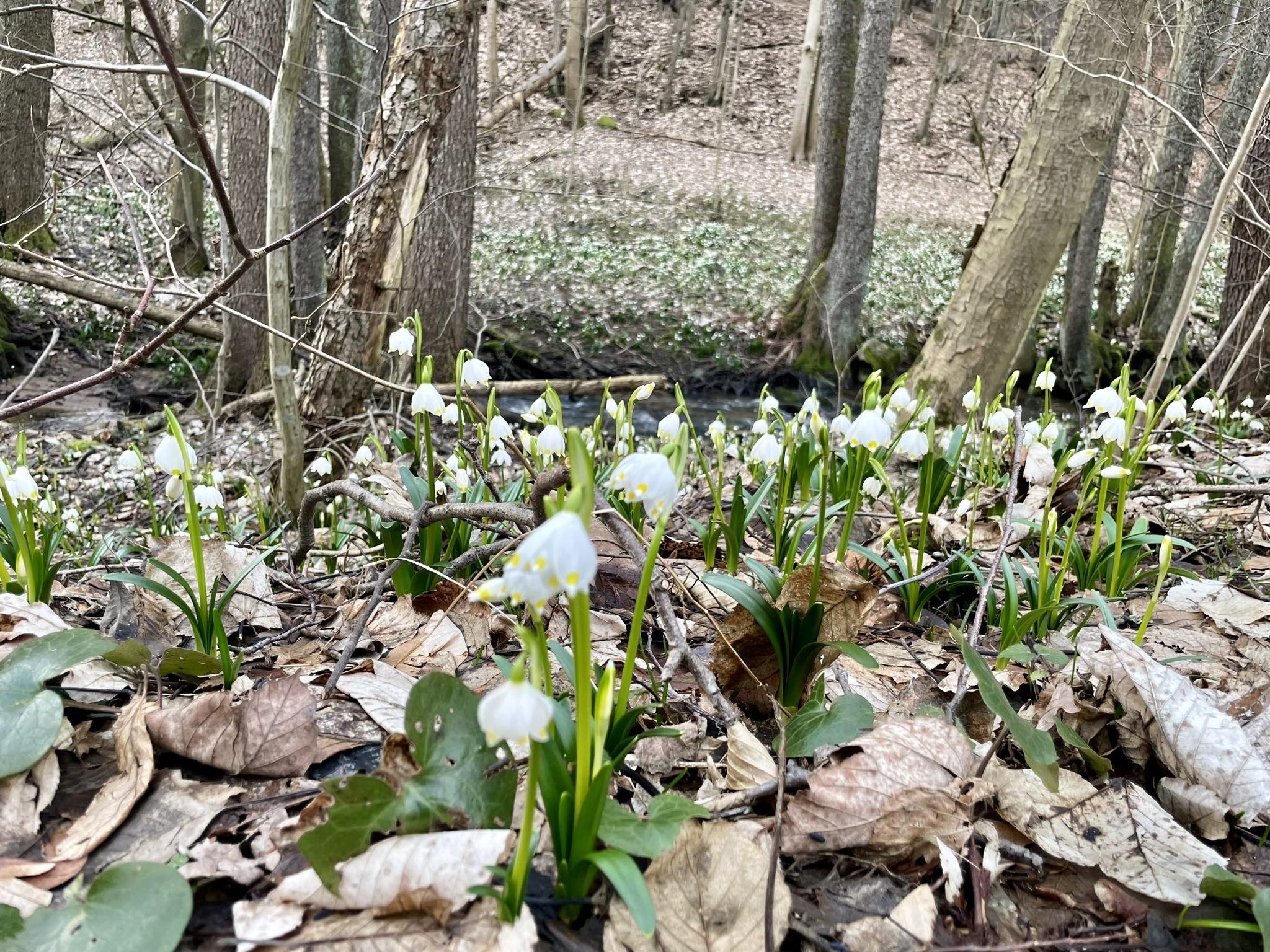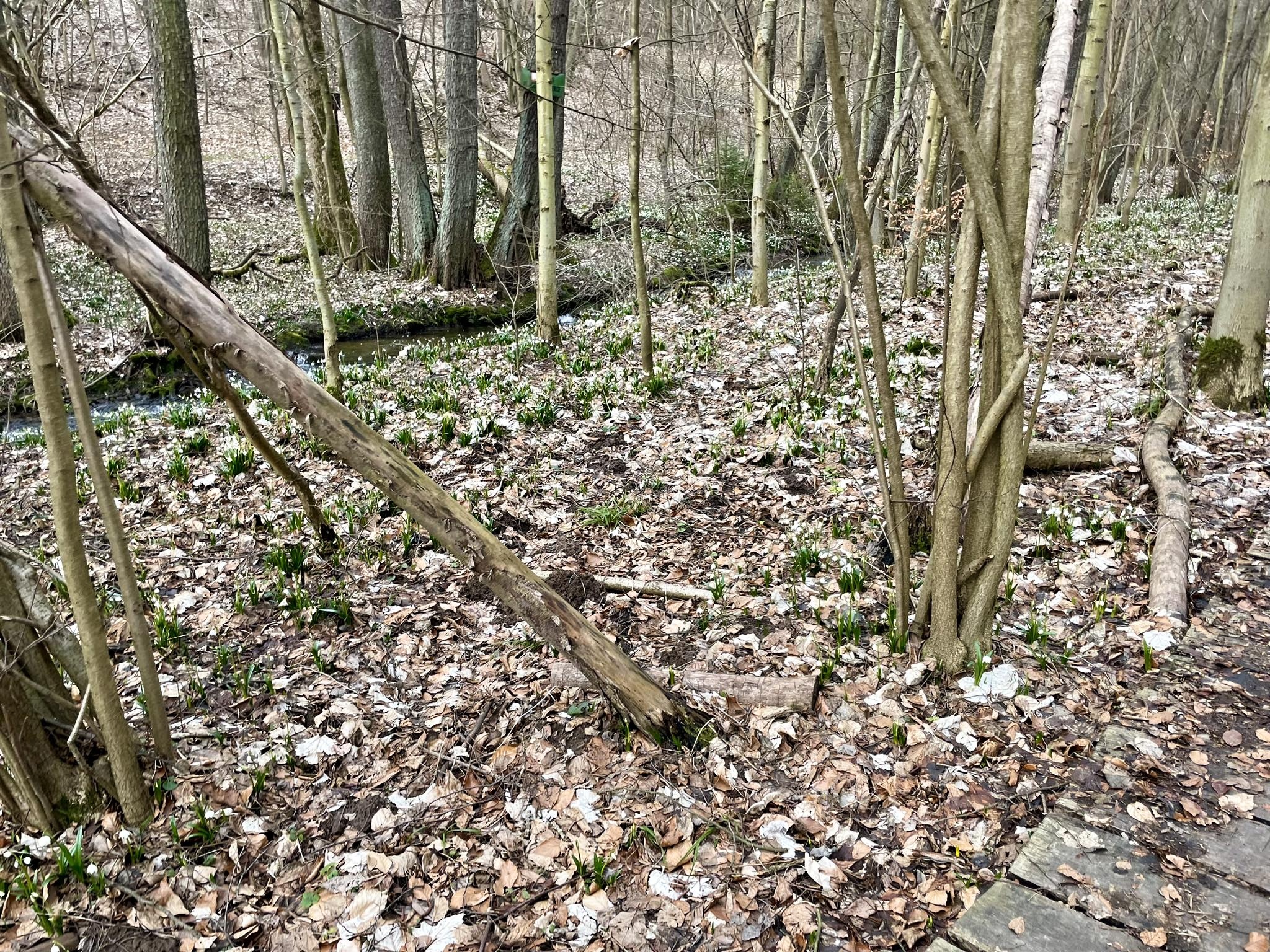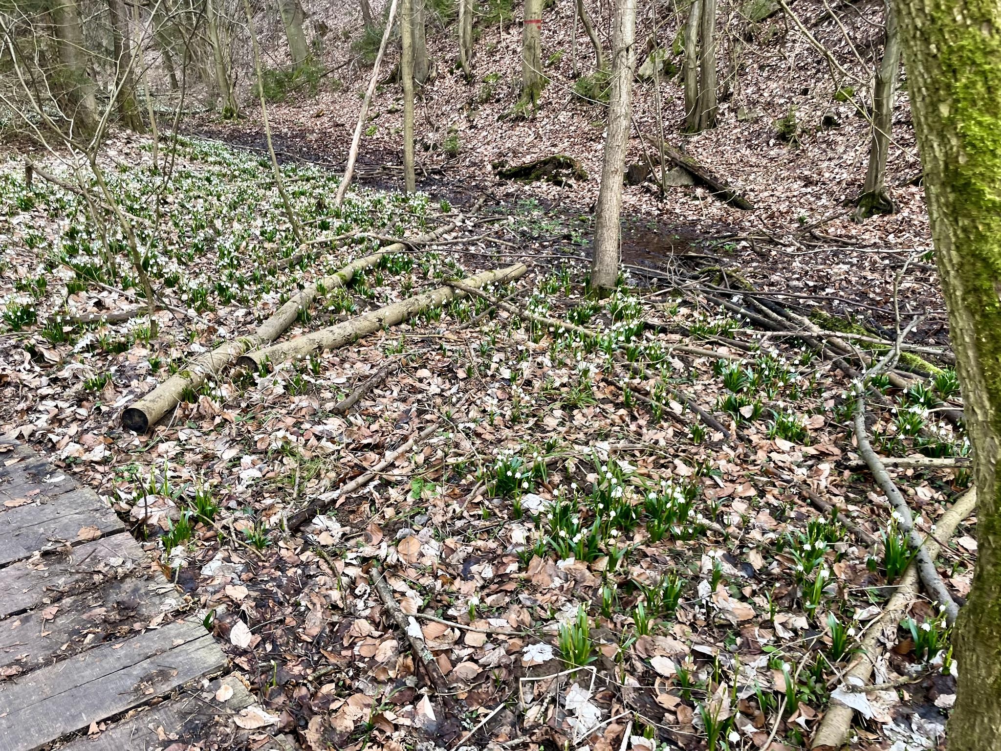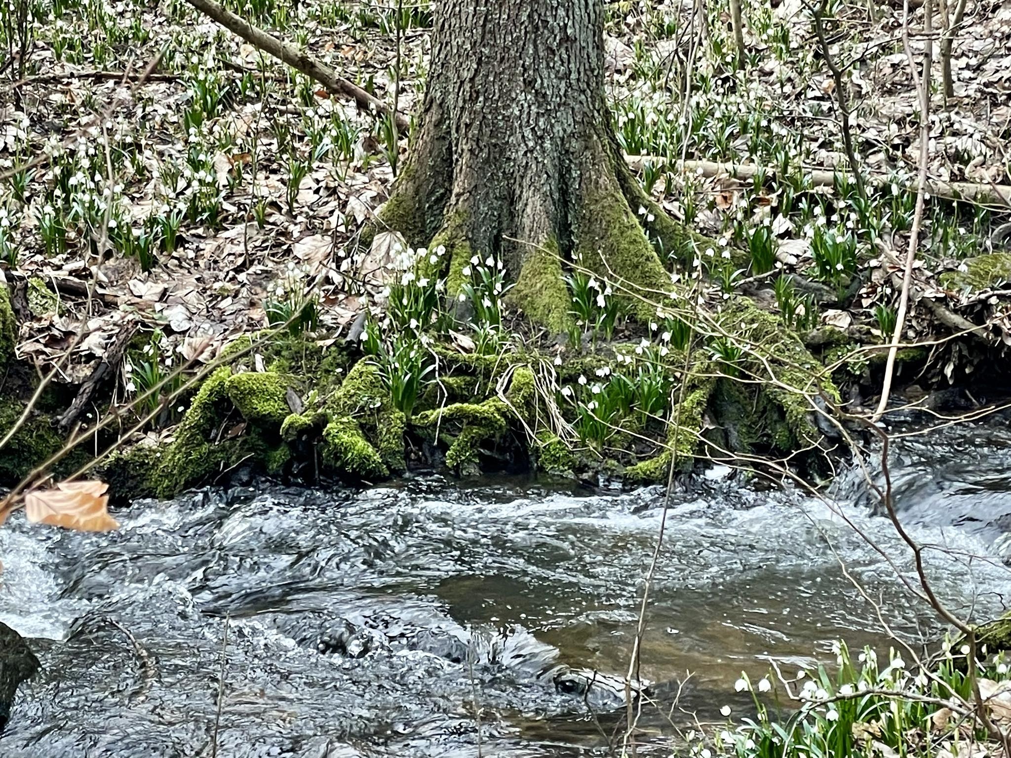 Přestože kalendář hlásí stále ještě zimu, v údolí Chlébského potoka už jaro vystrkuje drápky. Bledule jarní se roztahují nejen podél břehů tekoucí vody, ale také v širokém okolí.