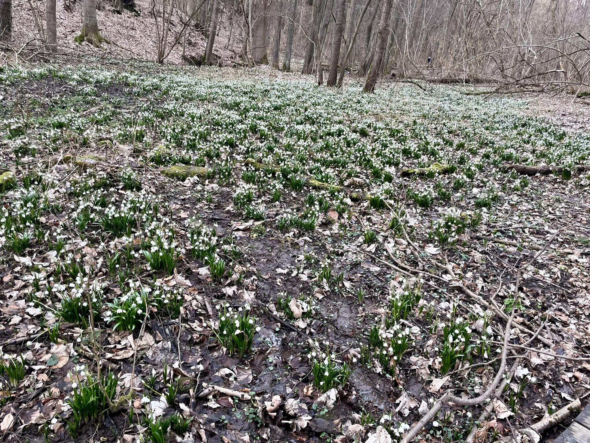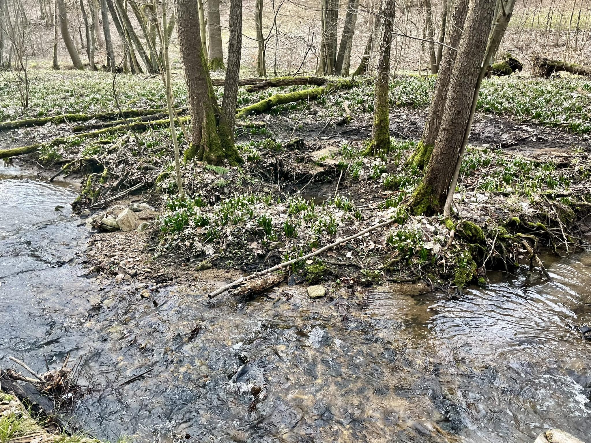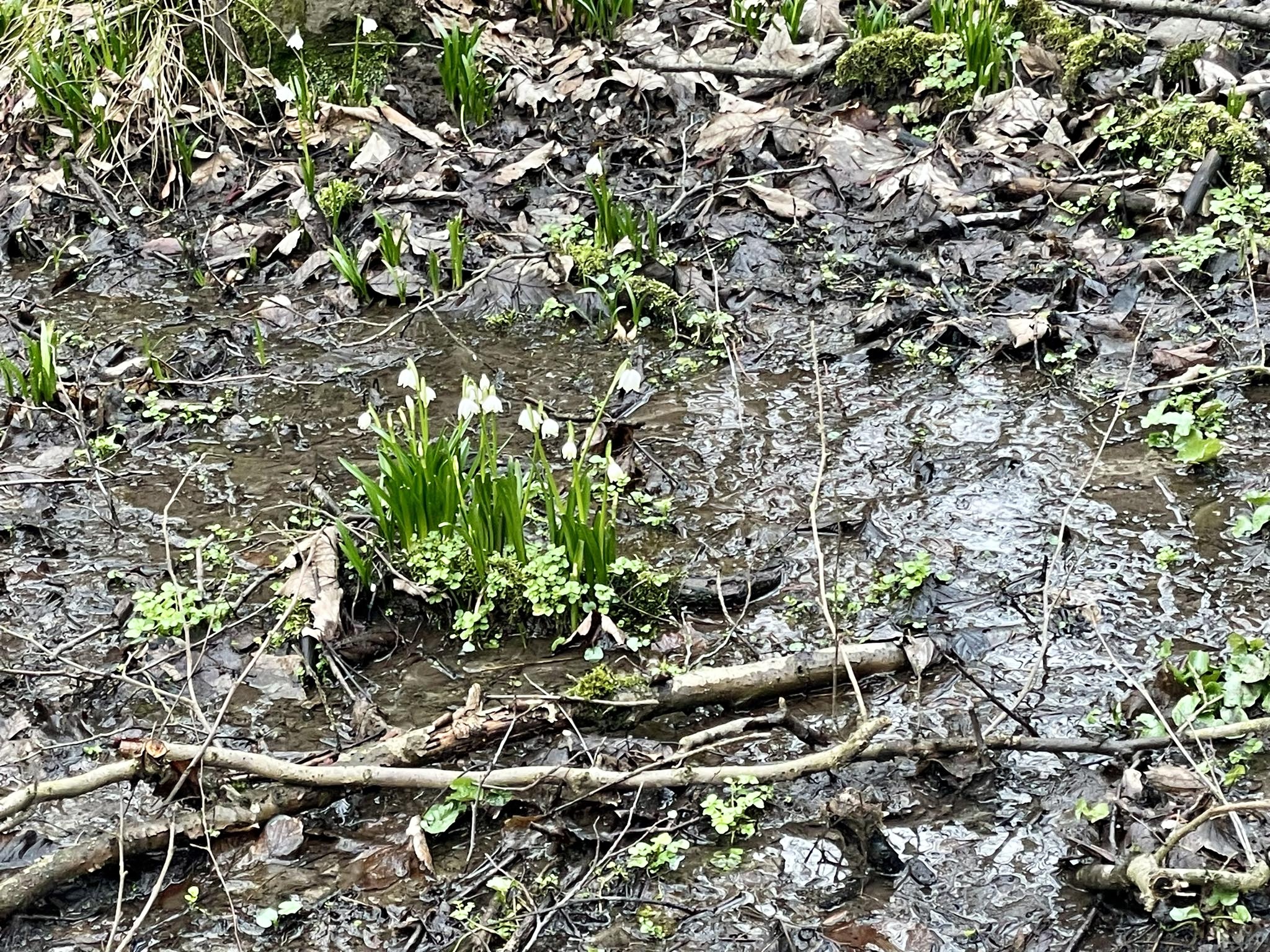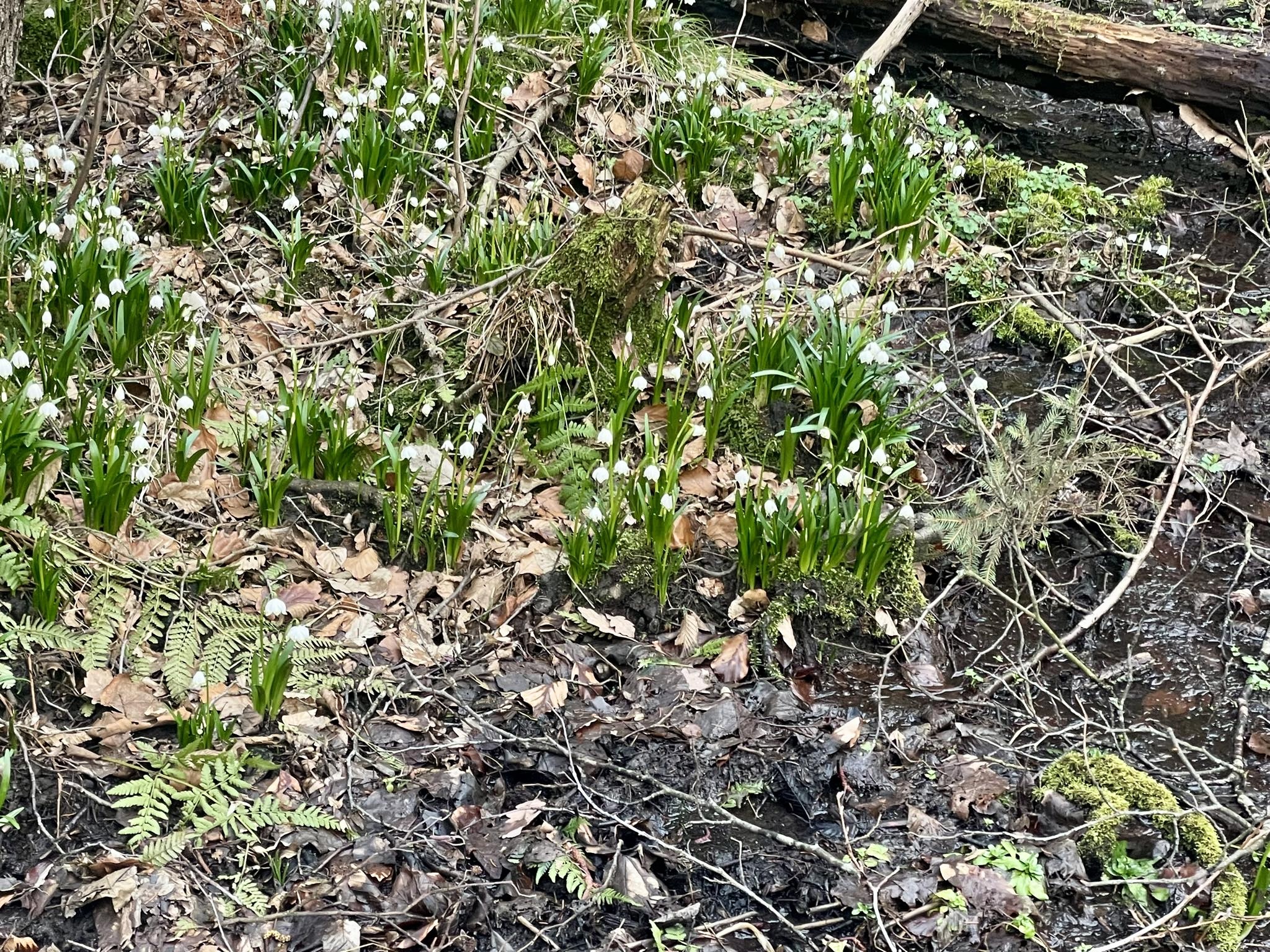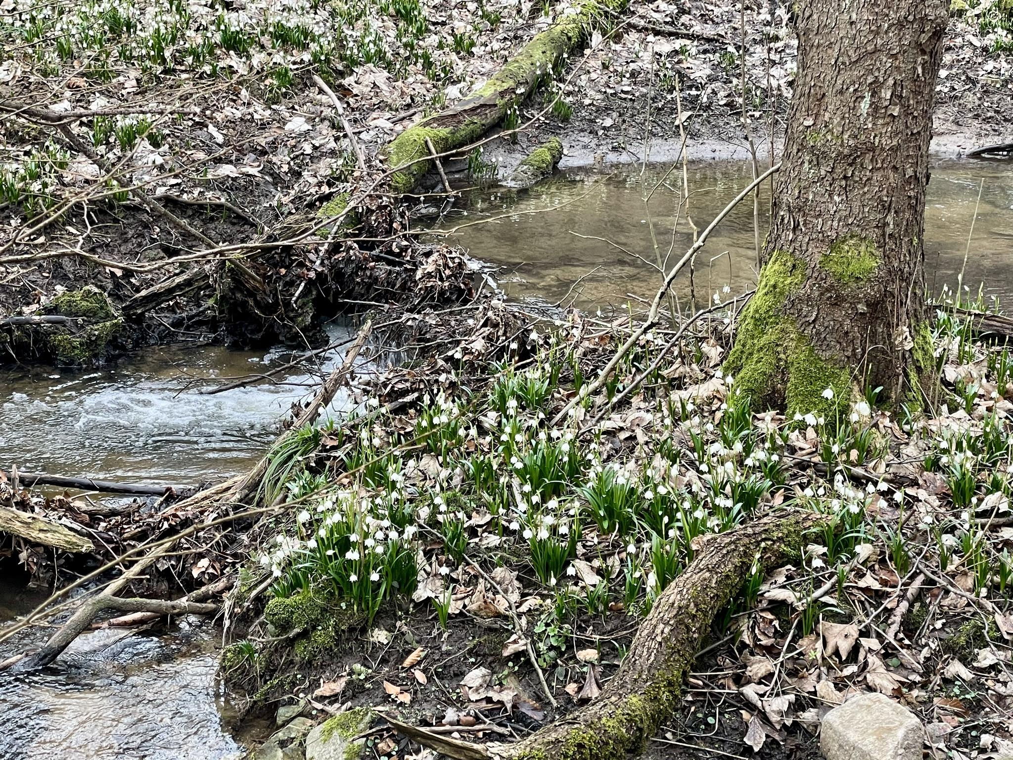 Přestože kalendář hlásí stále ještě zimu, v údolí Chlébského potoka už jaro vystrkuje drápky. Bledule jarní se roztahují nejen podél břehů tekoucí vody, ale také v širokém okolí.
