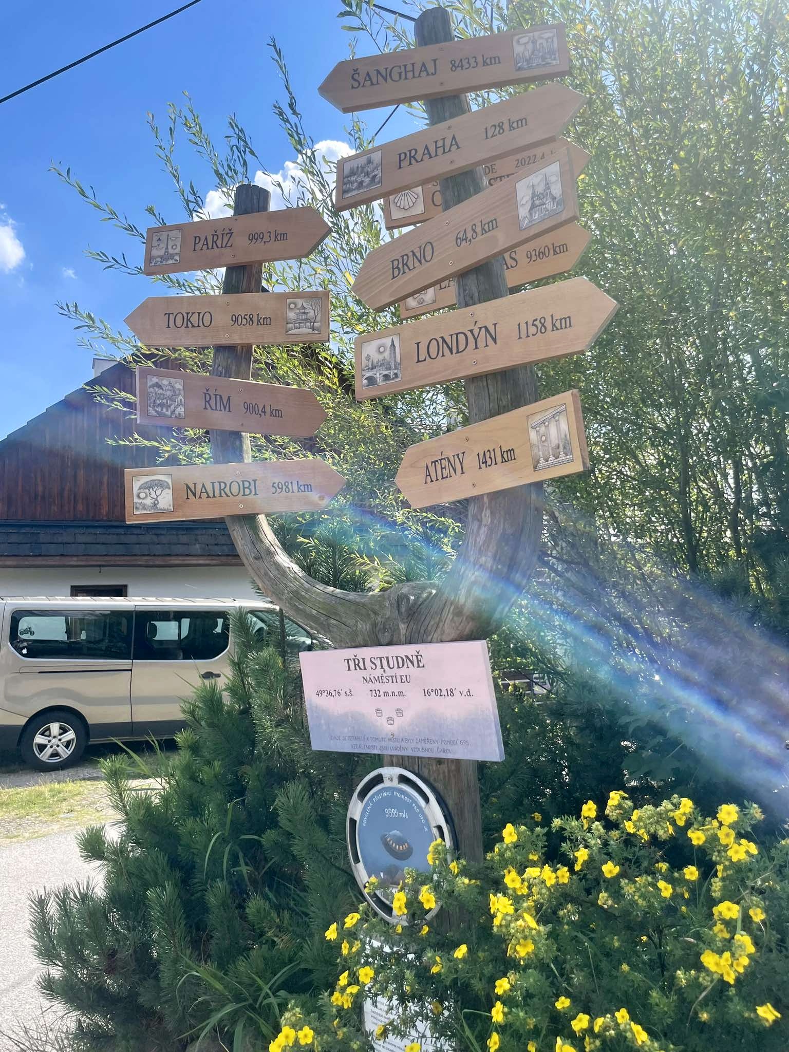 Třístudeňské náměstí se může pochlubit unikátním rozcestníkem, který je dílem malíře Ivana Svatoše. „Malovaný rozcestník na Náměstí EU vznikl ve Třech Studních před dvaceti lety jako recese. Okamžitě se stal ikonickým symbolem této malebné vesnice a oblíbeným turistickým lákadlem. U příležitosti letošního jubilea jej malíř Ivan Svatoš zrekonstruoval a směrovky do světových metropolí od Říma přes Las Vegas až po Tokio doplnil i jejich vyobrazeními. A objevil se dokonce i jeden zcela nový ukazatel – návštěvníci se mohou dozvědět, jak daleko je to do slavného poutního místa Santiago de Compostela. A protože jde zejména o recesi, najdou zde výletníci i oblíbenou humoristickou značku ‚povolená přistávací rychlost pro UFO'," pousmál se Jan Svatoš.