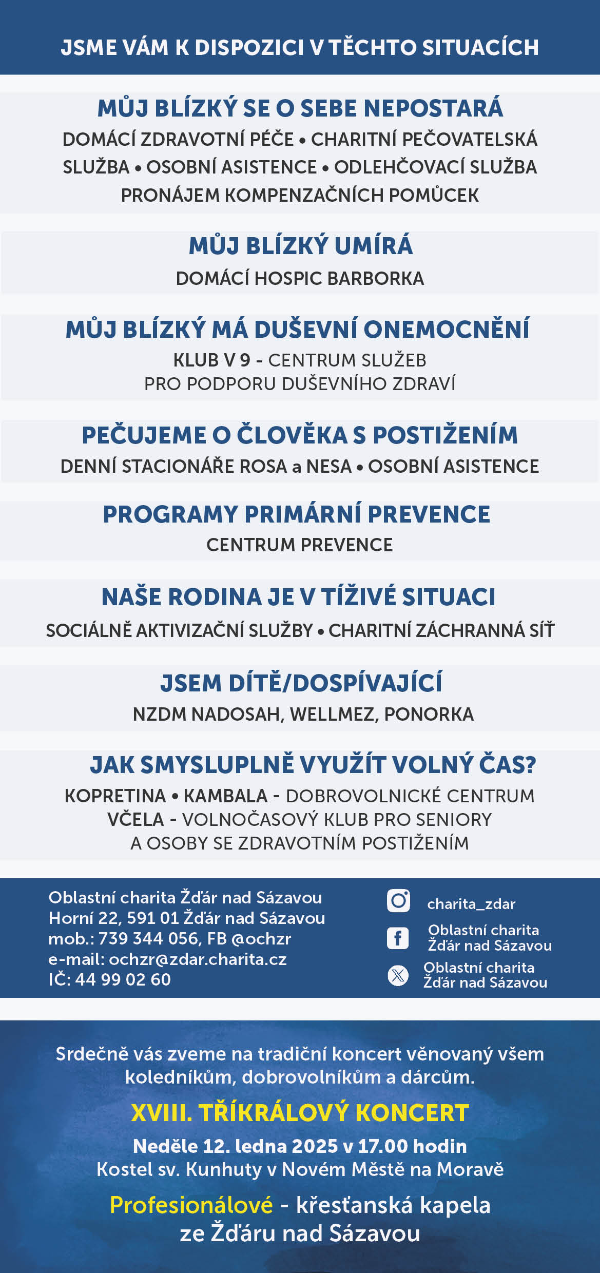 Jako poděkování pro koledníky se v neděli 12. ledna v 17.00 uskuteční Tříkrálový koncert v kostele sv. Kunhuty v Novém Městě na Moravě. Letos na něm vystoupí žďárská kapela Profesionálové.