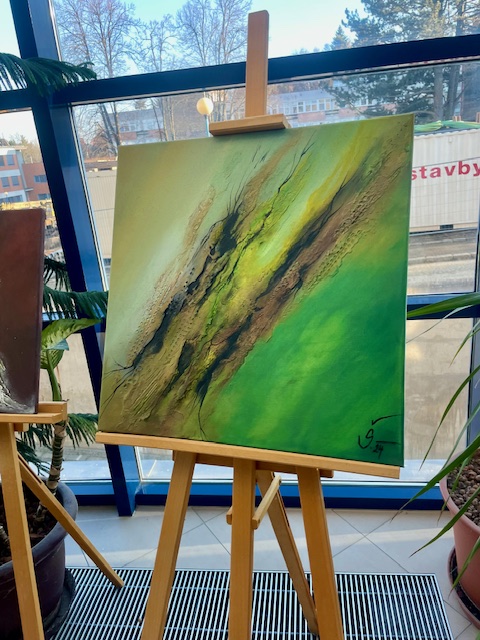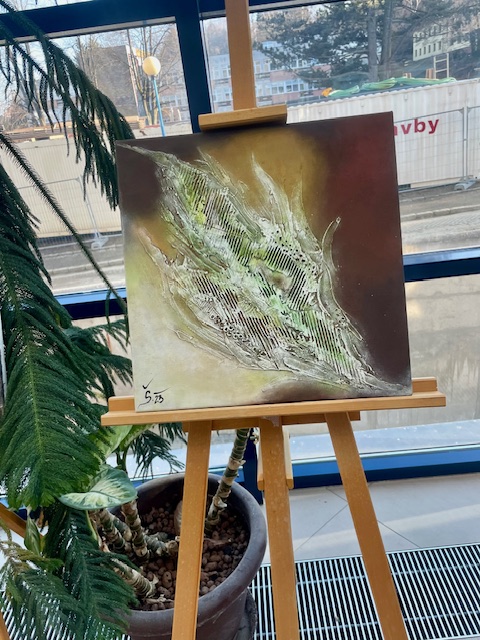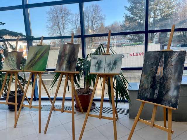 Obrazy Jiřího Havlíka jsou malované akrylem, Zlata Švandová si zase ráda pohraje s kombinovanou technikou.
