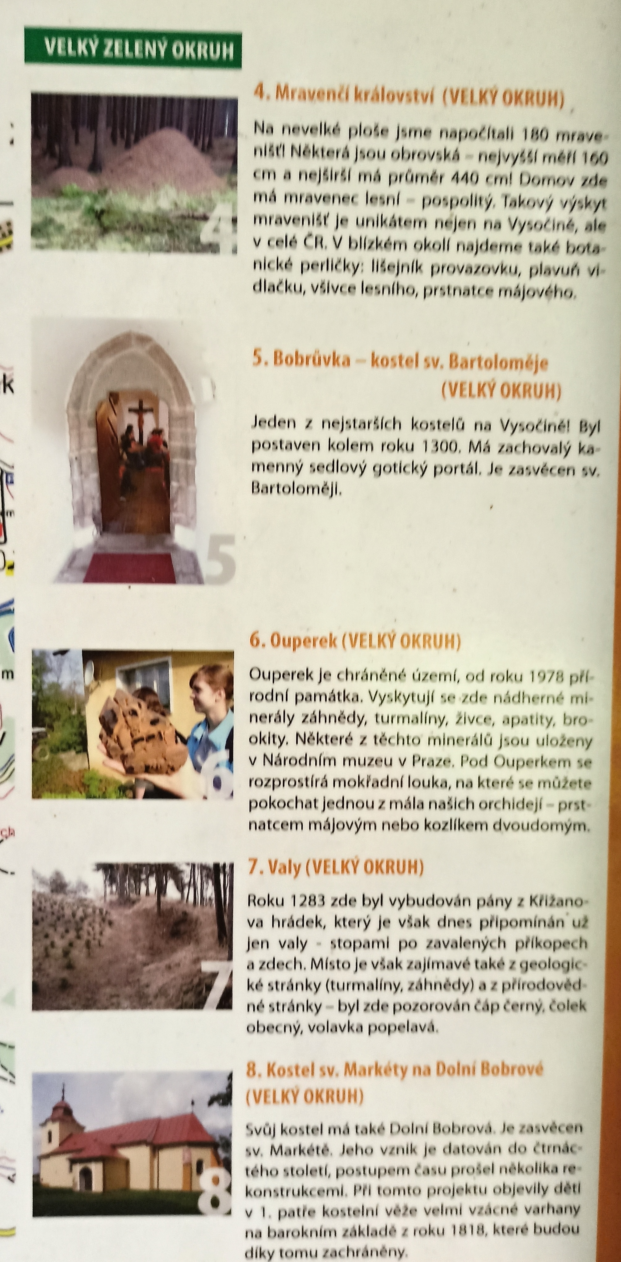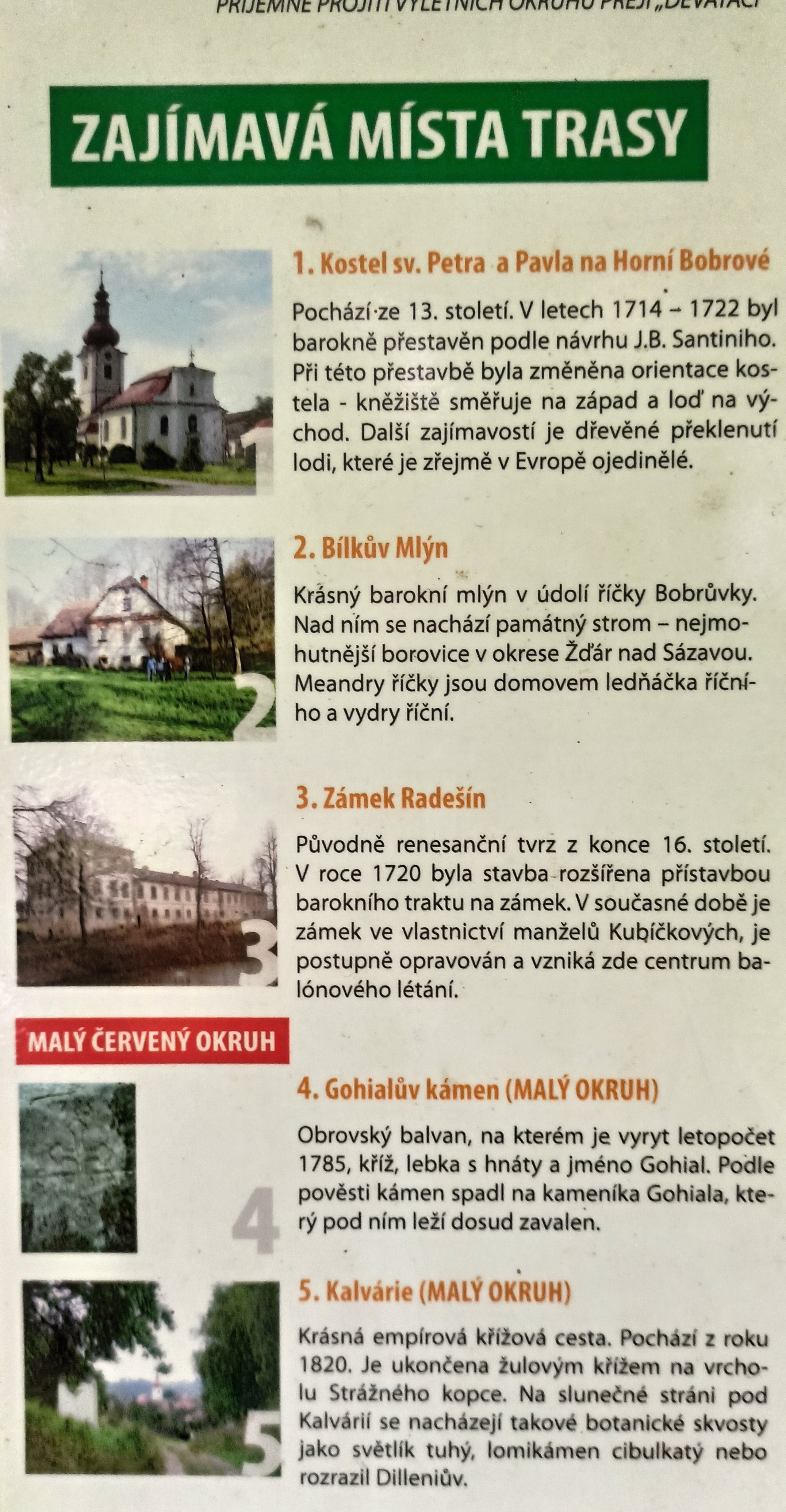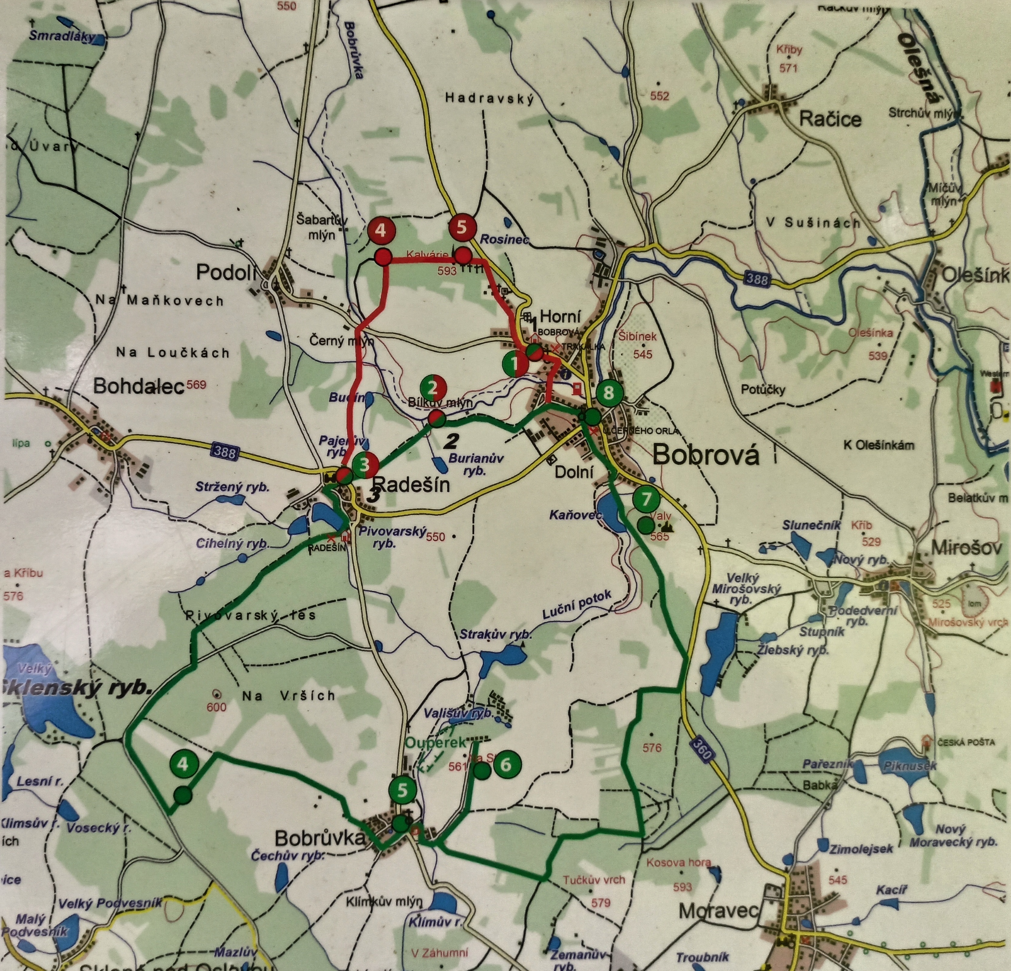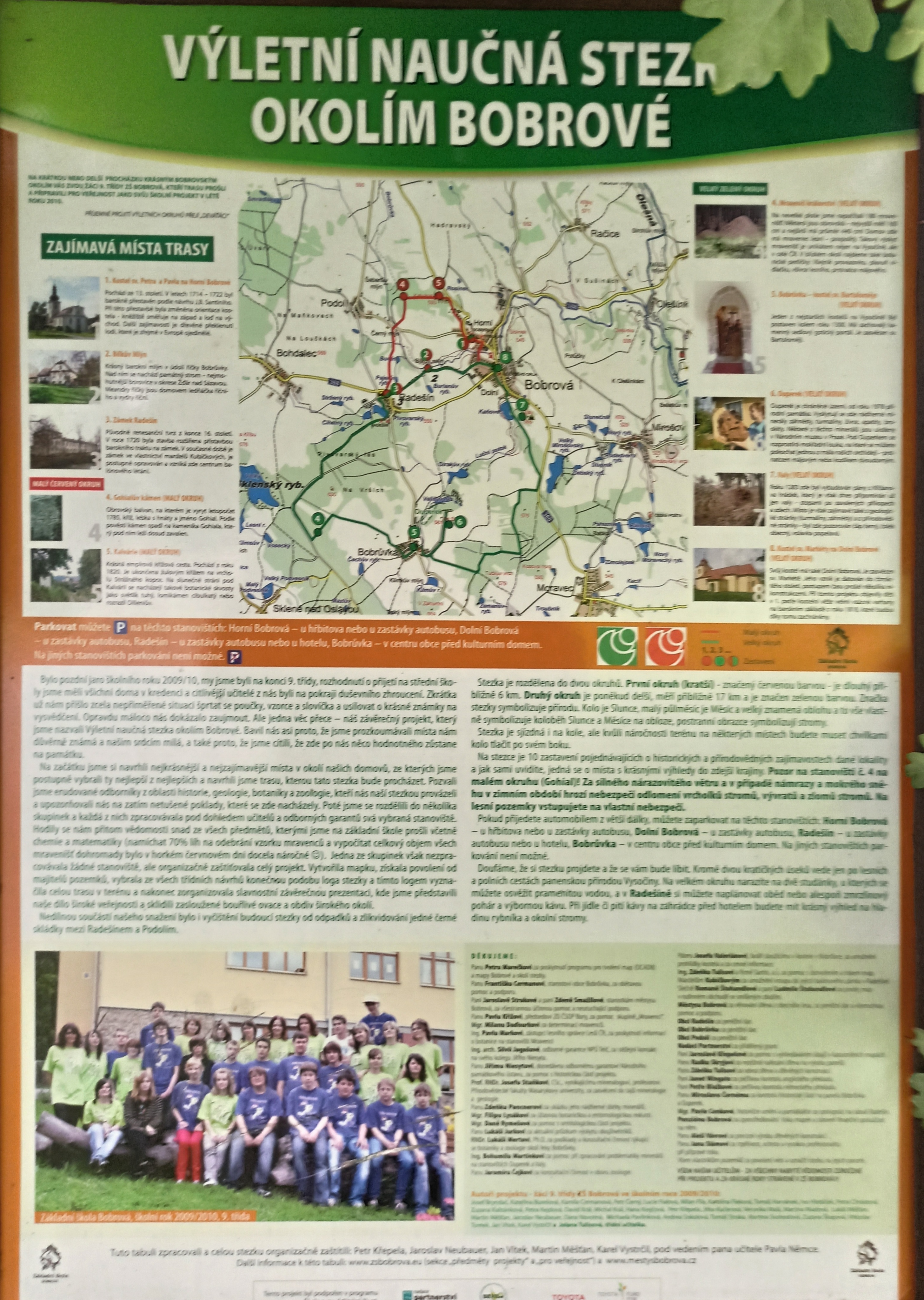 Výletní naučná stezka okolím Bobrové má 2 okruhy. Kratší okruh měří 6 km a je označen červenou turistickou značkou. Delší okruh pak měří 17 km a je označený zeleně. První tři stanoviště jsou shodné pro obě trasy, pak se cesty dělí. Zajímavostí je to, že byla stezka vybudována žáky místní základní školy v rámci letního projektu v roce 2010. Cesty vedou po místních lesích a krásných loukách. Na své si tak přijdou všichni milovníci přírody.