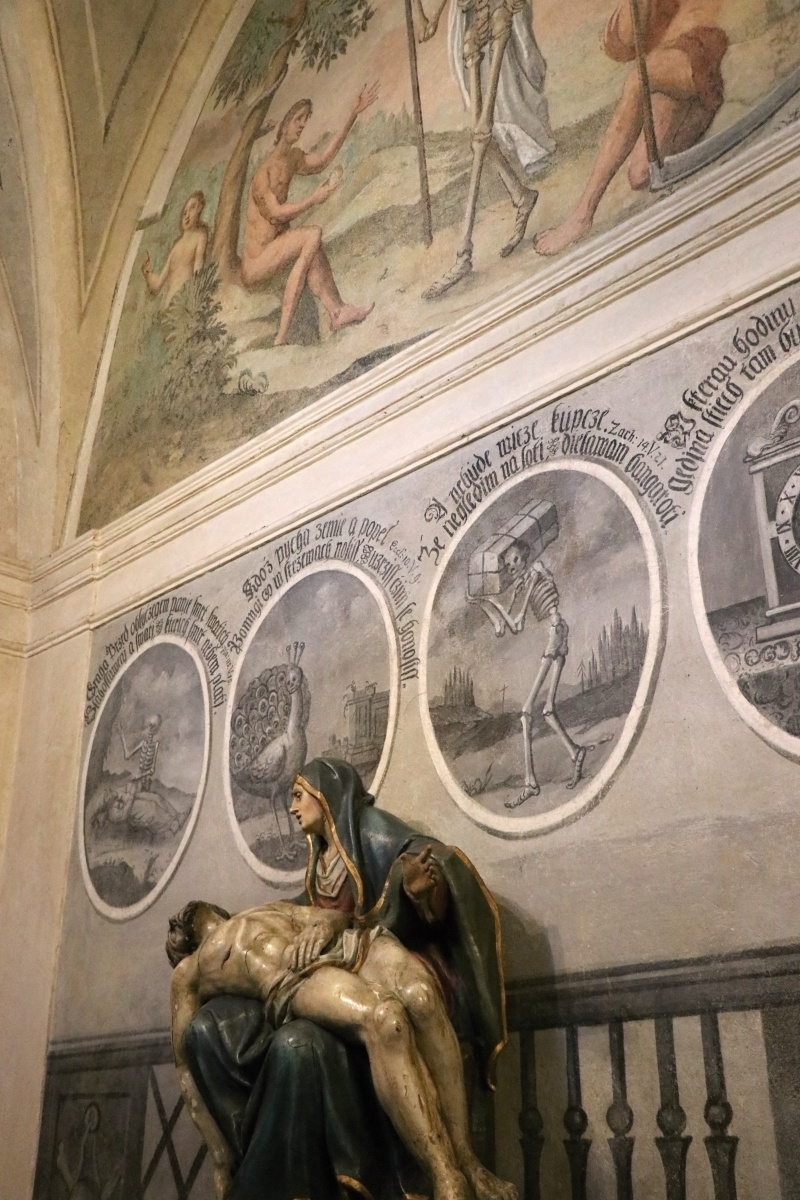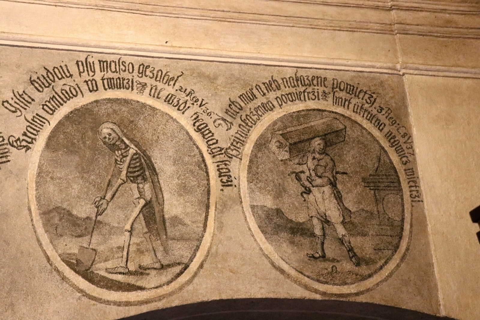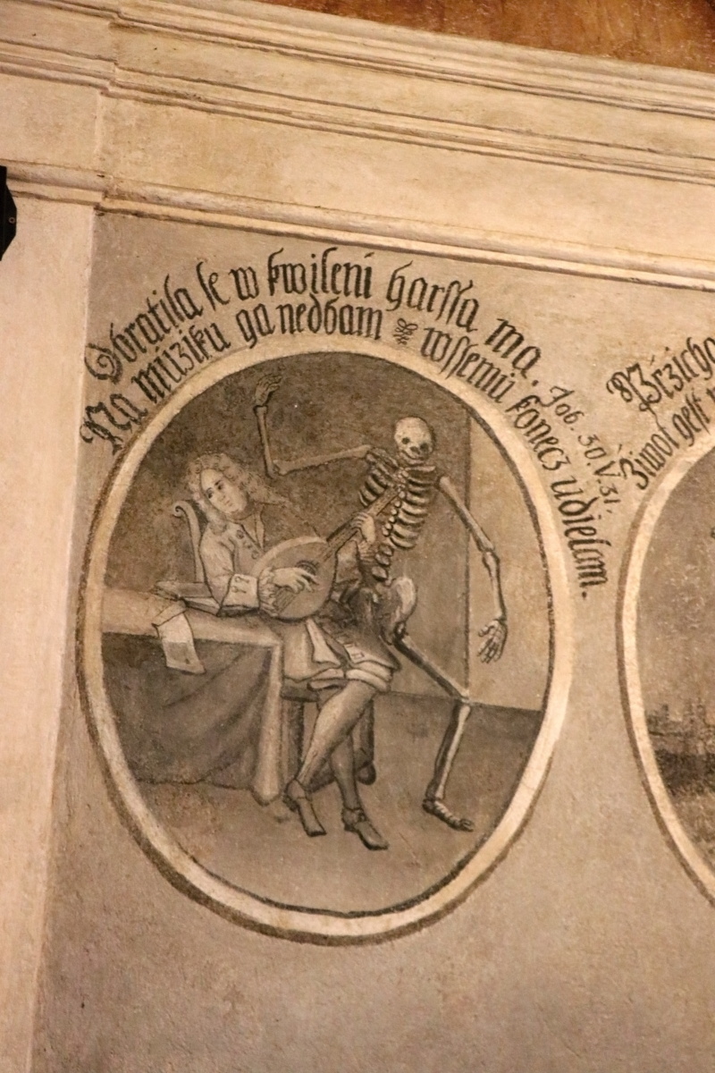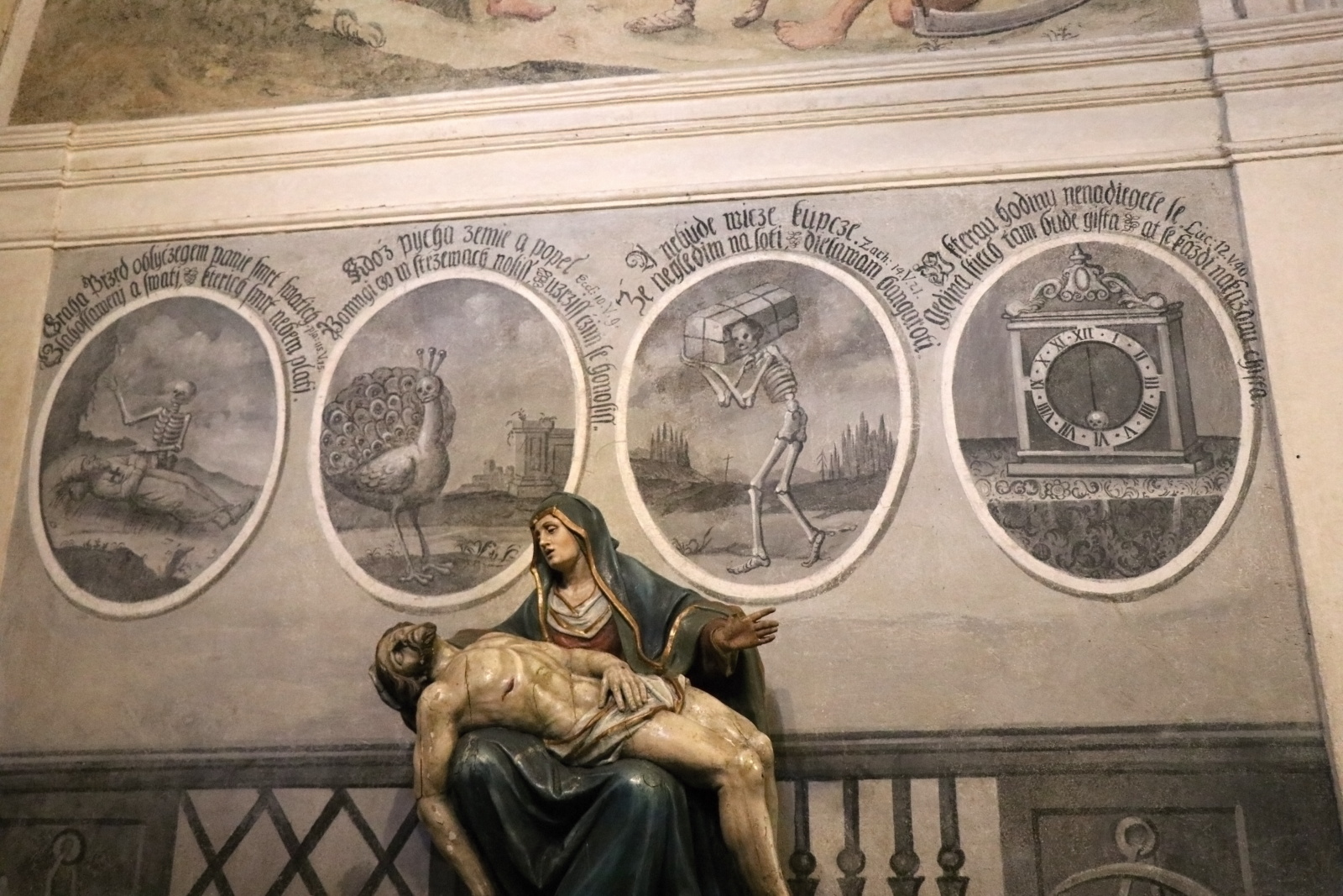 Dalších osmadvacet černobílých obrázků připomíná pomíjivost lidského žití. „Asi dvacet let po zhotovení byly na nátlak věřících zabíleny a odkryty až na v první polovině padesátých let 20. století při restaurování barevných fresek," přibližuje osudy poněkud děsivých černobílých maleb novoměstský kostelník.