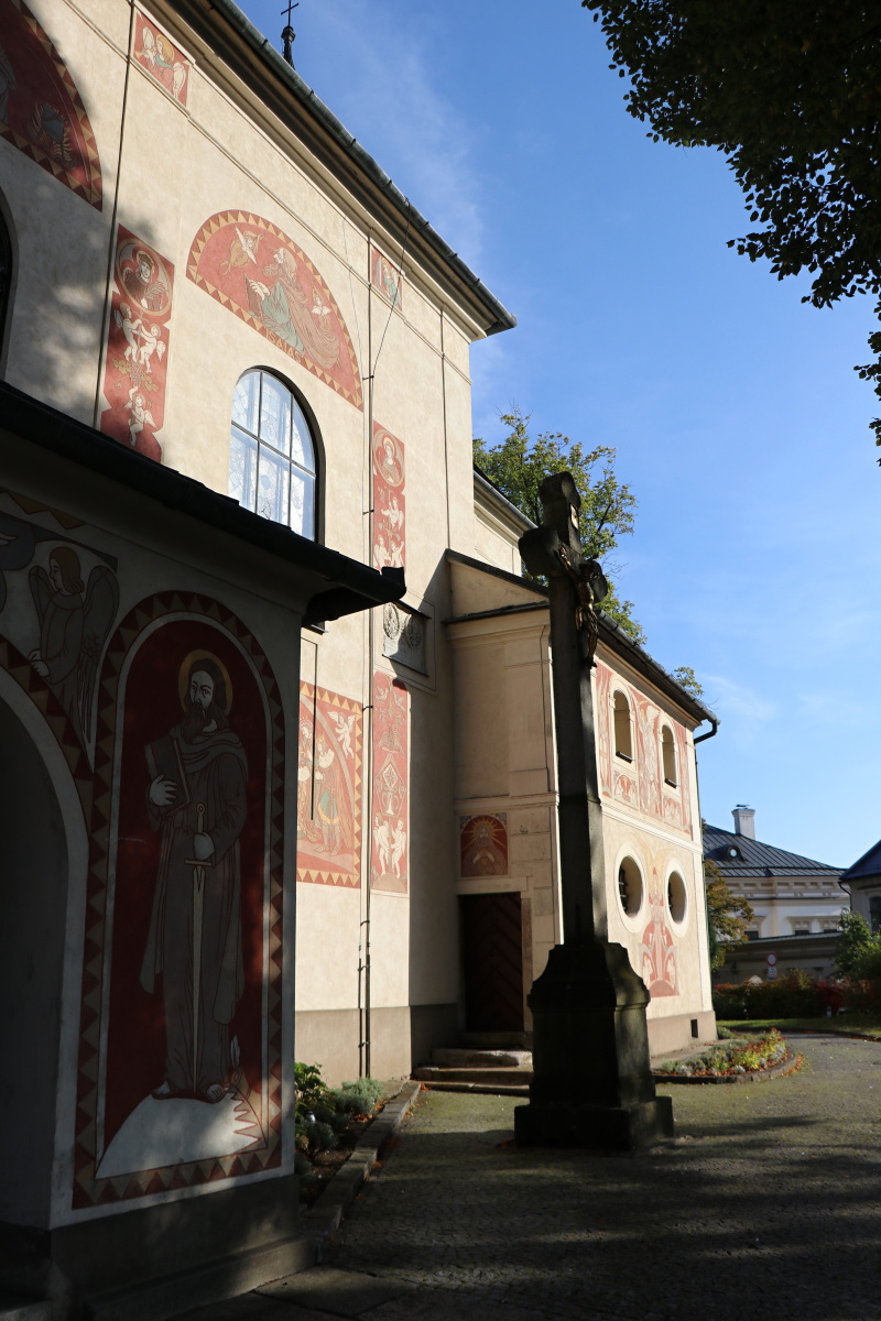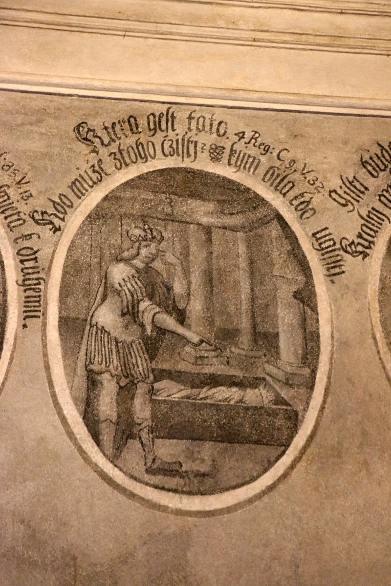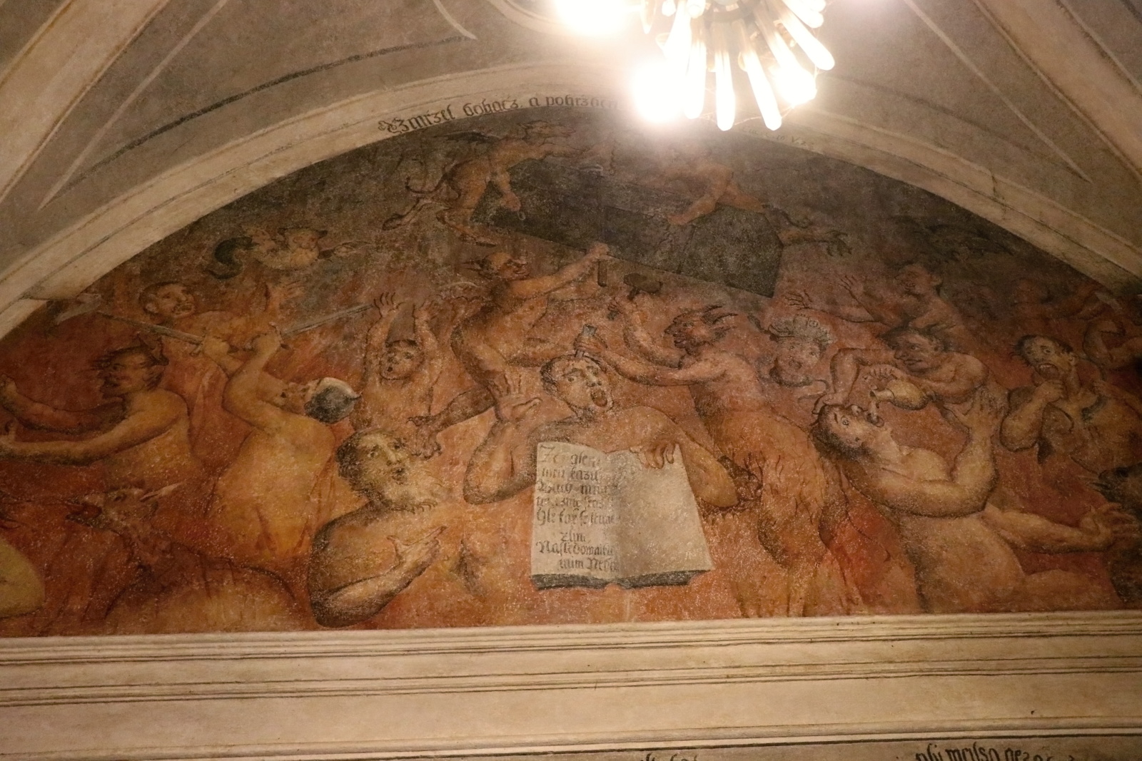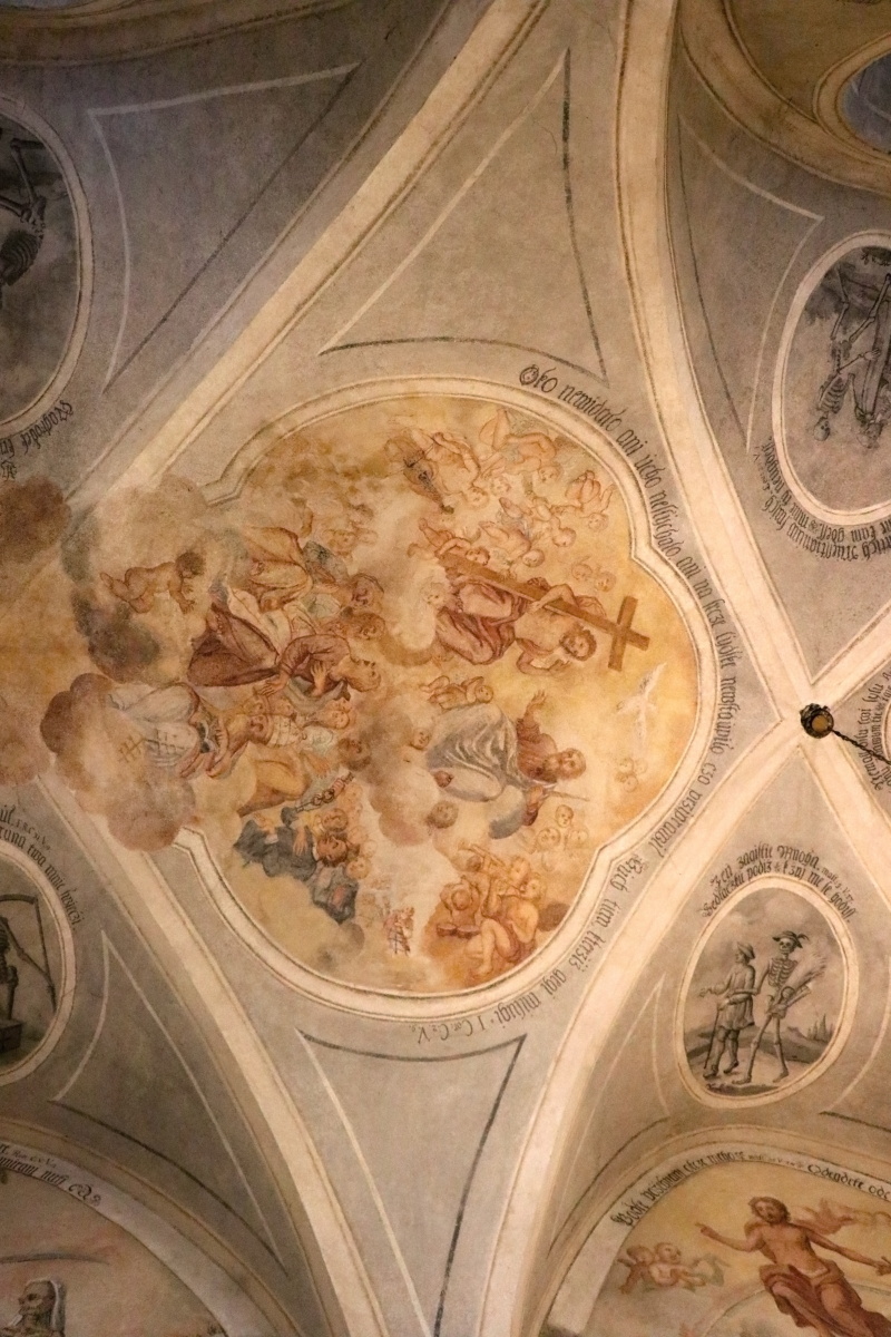 Dalších osmadvacet černobílých obrázků připomíná pomíjivost lidského žití. „Asi dvacet let po zhotovení byly na nátlak věřících zabíleny a odkryty až na v první polovině padesátých let 20. století při restaurování barevných fresek," přibližuje osudy poněkud děsivých černobílých maleb novoměstský kostelník.