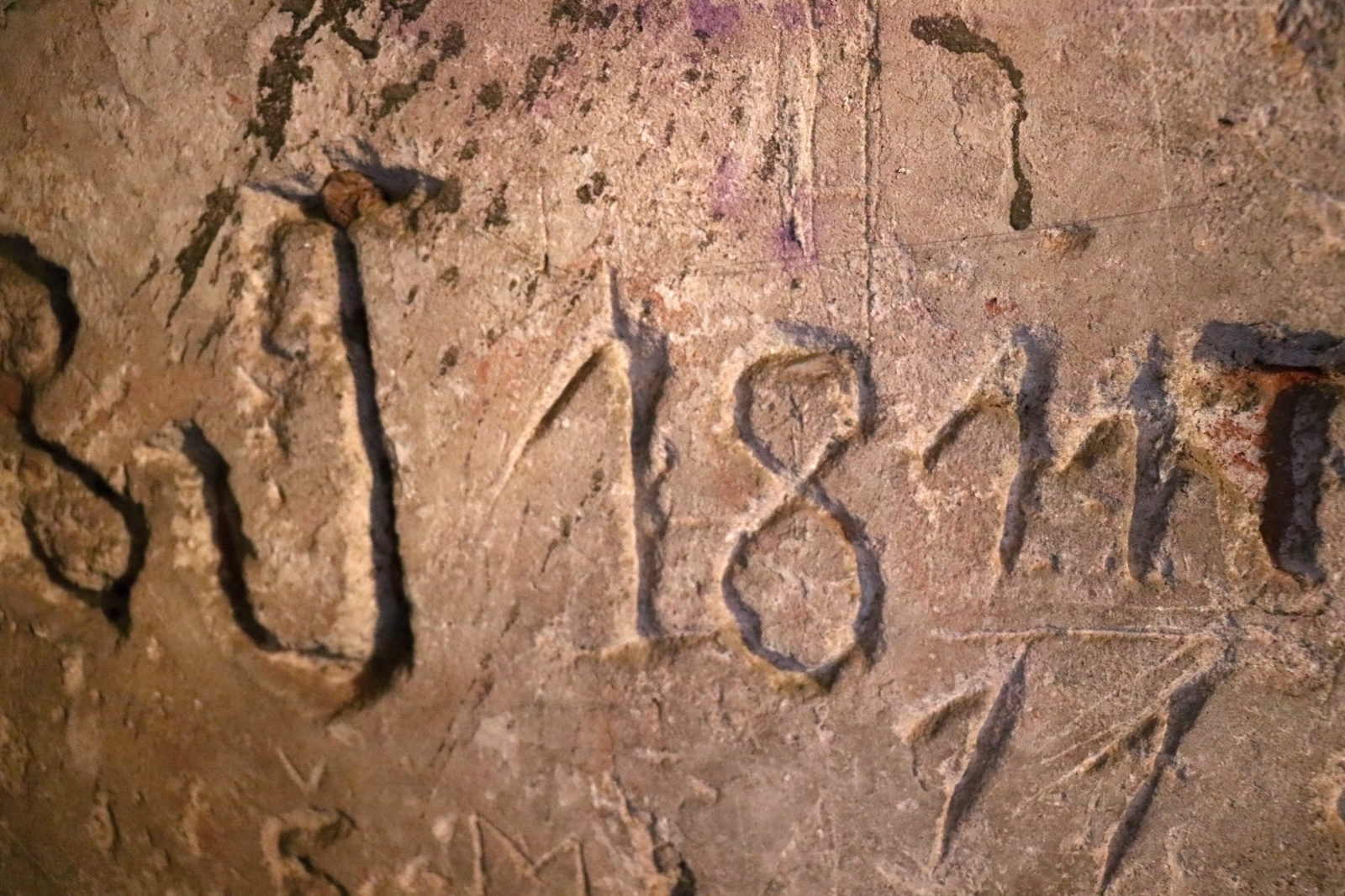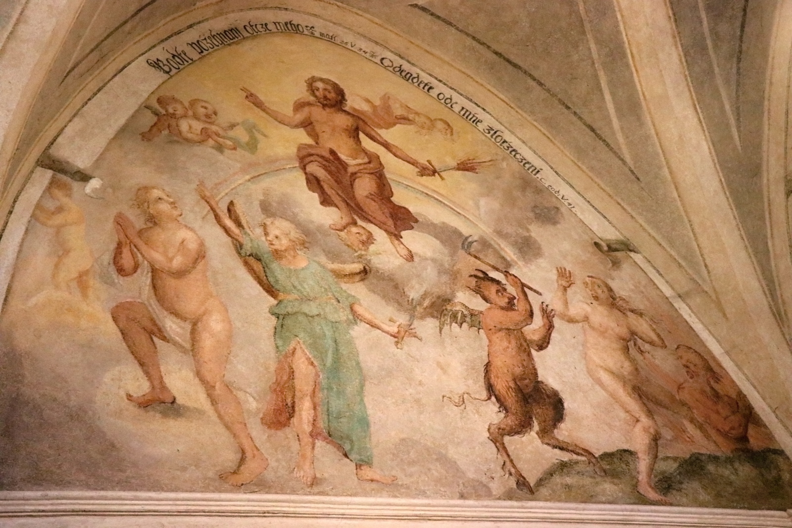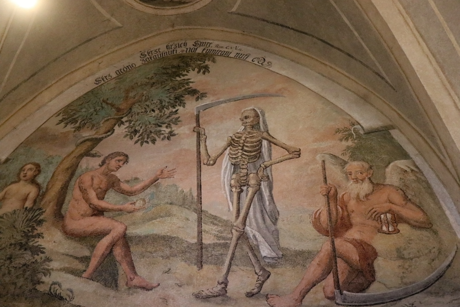 „Na jižní stěně vlevo je zase freska s názvem Prvotní hřích. Zobrazuje Adama a Evu v době, kdy porušili zákaz trhat a jíst ovoce ze stromu poznání dobra a zla. Byli nejen z ráje vyhnáni, ale ztratili i nesmrtelnost. To vyjadřuje smrtka s kosou a andělem držící přesýpací hodiny, neboť jim začal plynout i čas," pokračuje.