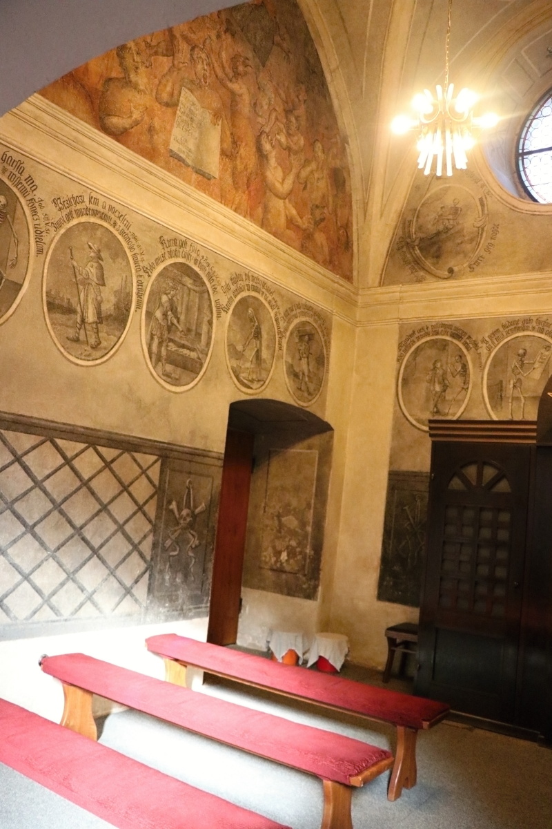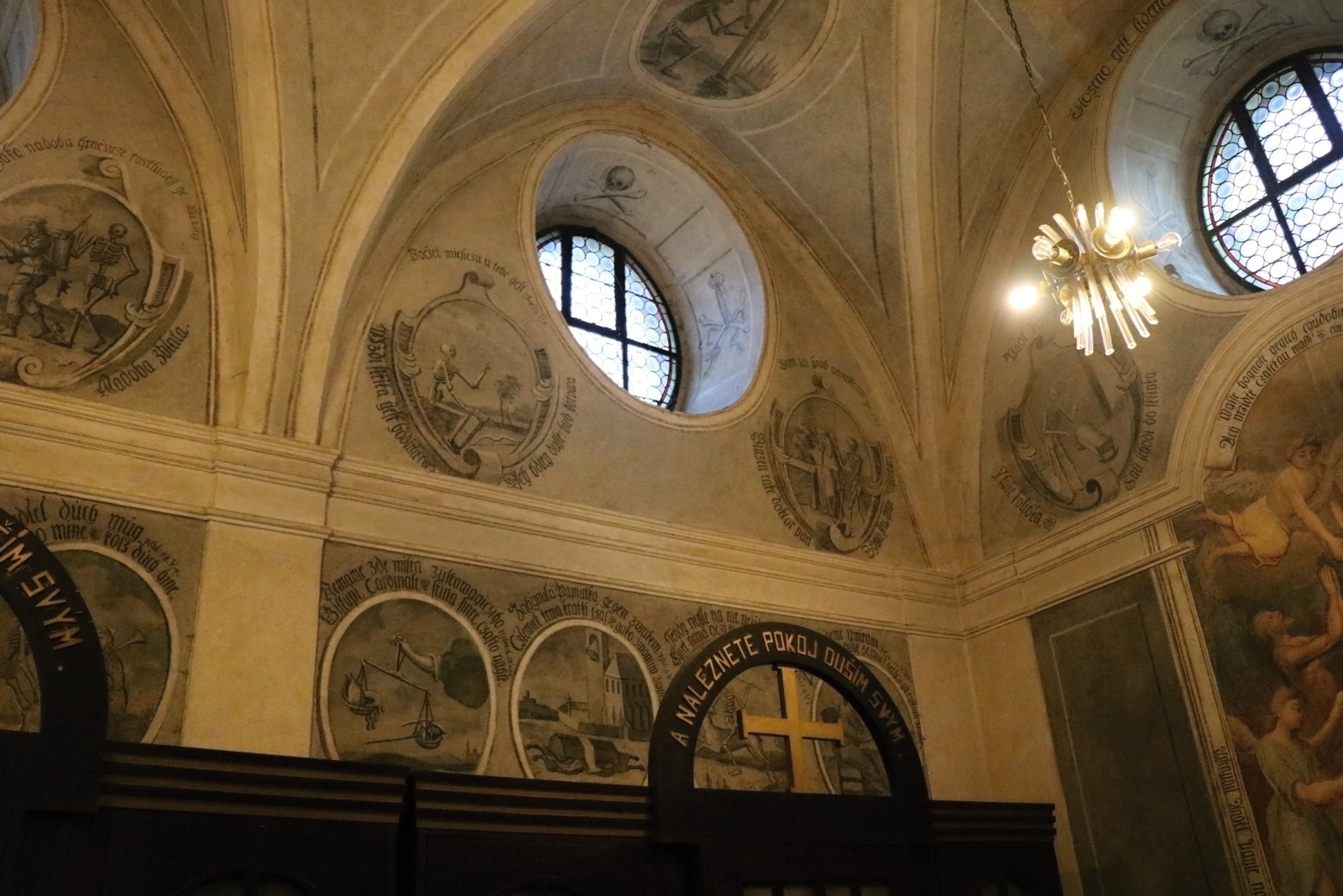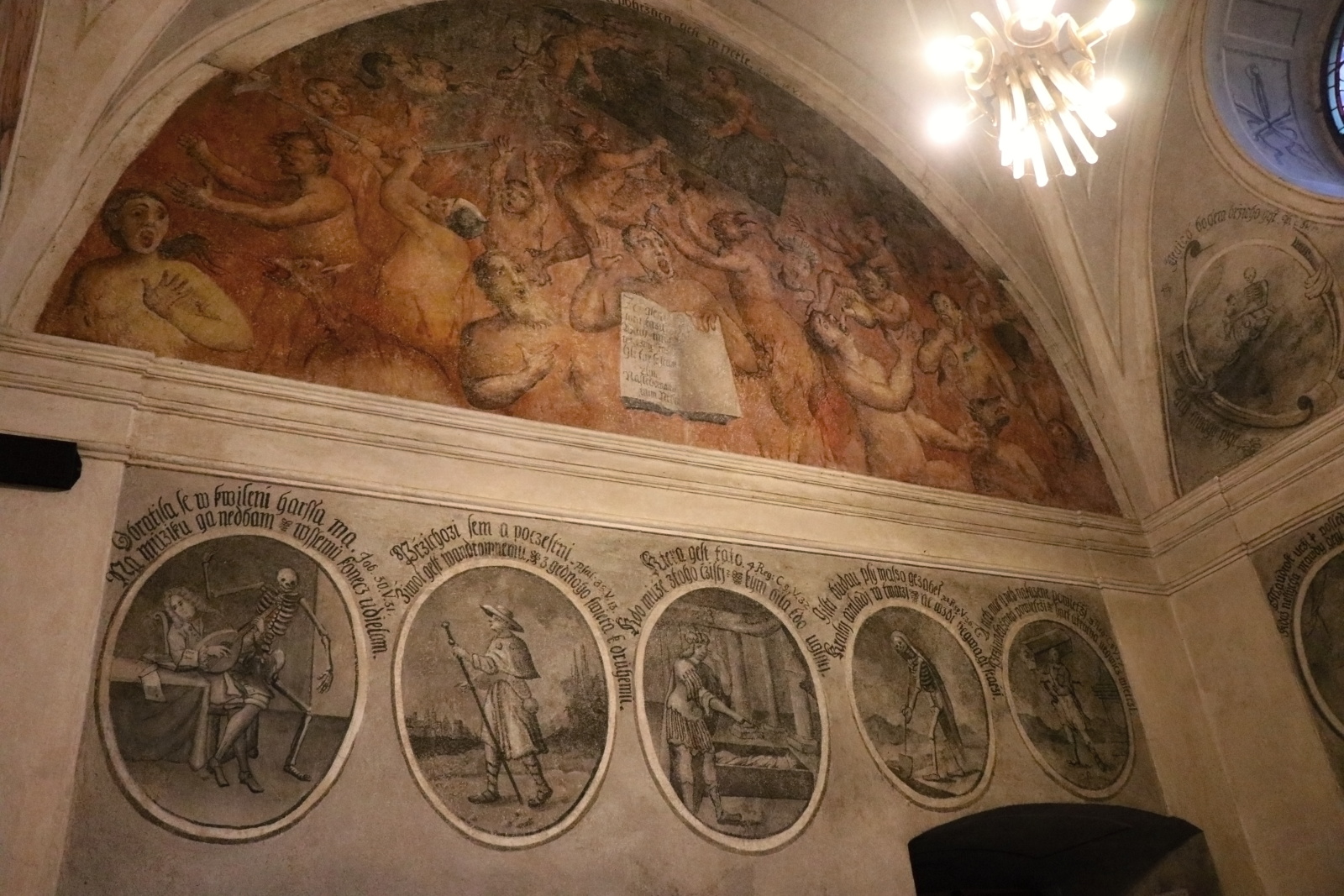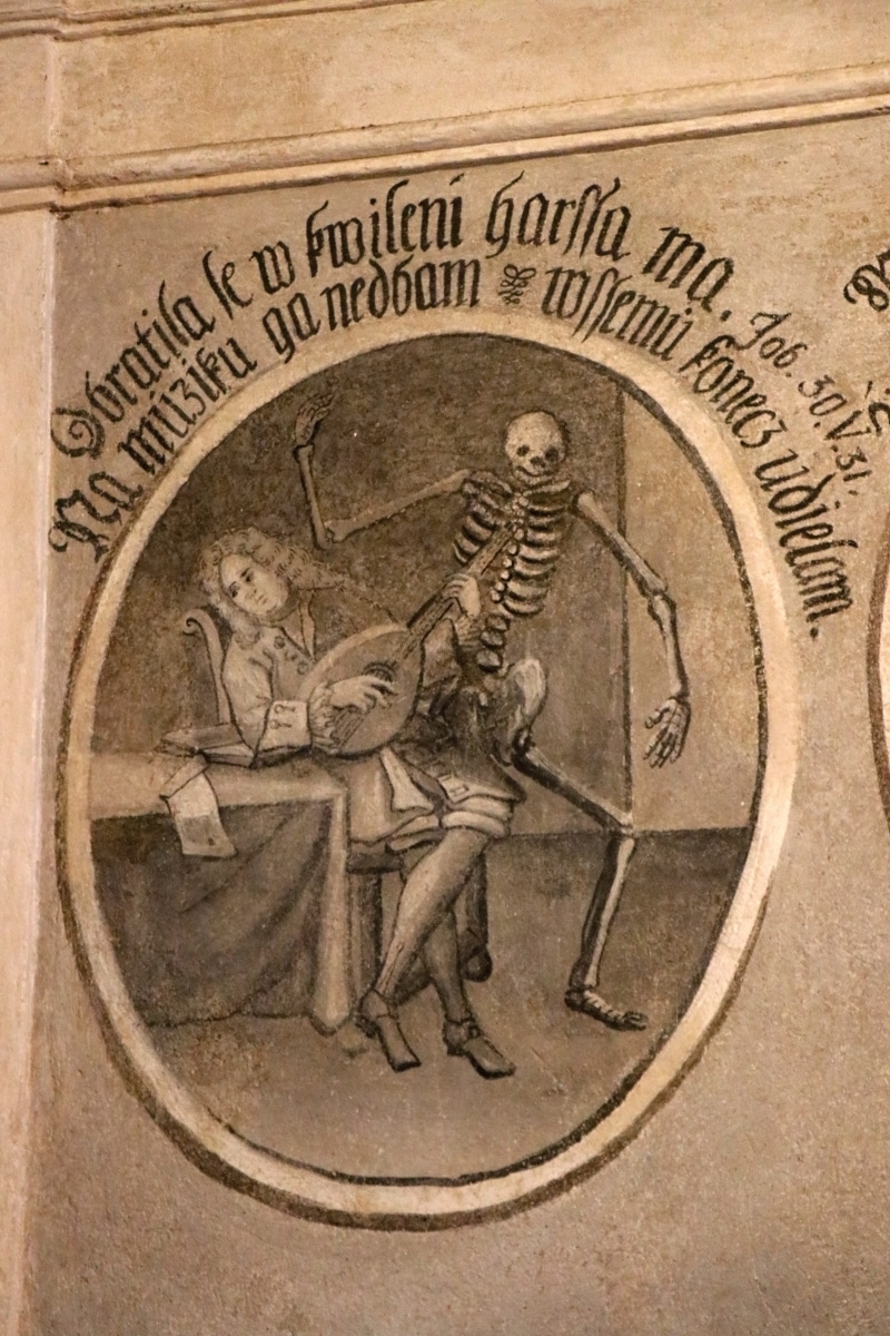 Jako by celá kaple rezonovala středověkým heslem Memento mori – pamatuj na smrt. Smrtka doprovází boháče, hudebníka, lékaře, měšťany a mnohé další. Nikdo se před ní neukryje, s každým se na konci jeho života setká. To připomínají i nápisy, které jsou součástí jednotlivých maleb. „Pod levým oknem uvidíme například hodovníka a smrtku doplněného nápisy: Jejich bohem a Ach mnohý pije. Smrt jej najde. Je to odkaz na svatého Apoštola Pavla v Listu k Filipanům. Jejich koncem je zahynutí, jejich bohem břicho a jejich chloubou to, zač by se měli stydět, neboť smýšlejí přízemně. Vedle pak vidíme Hrnčíře a smrtku s nápisem: Jako nádobu hrnčíře roztlučeš je a Sláva jest ta. Nádoba z bláta a odkazuje na Janovu Apokalypsu: Bude je pást železnou berlou, jako hliněné nádobí je bude rozbíjet. Pod pravým oknem vlevo je zase smrtka s náčiním lukostřelce s nápisy: Počet měsíců u tebe jest a Vždy skryta je hodina ta. Ach bděj duše! Buď hotova. Odkazuje nás na knihu Jobovu, kde se praví: Jestliže jsou stanoveny jeho dni, počet jeho měsíců je v mé moci, nepřekročí cíl, jenž jsi mu vytkl," vyjmenovává některé obrázků s nápisy Ladislav Harvánek.