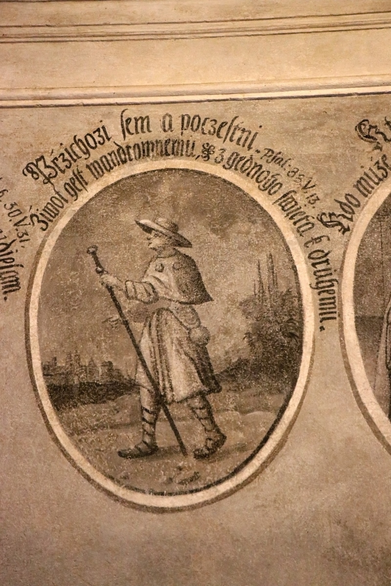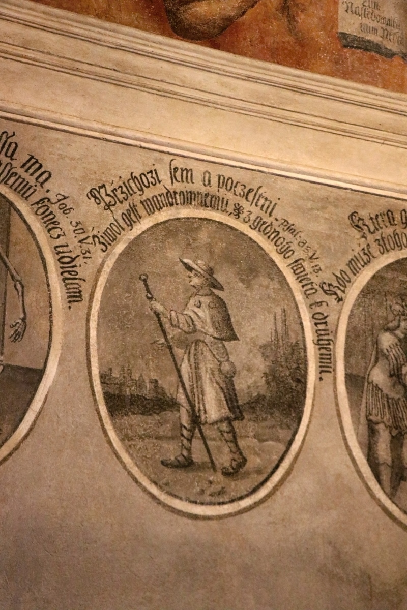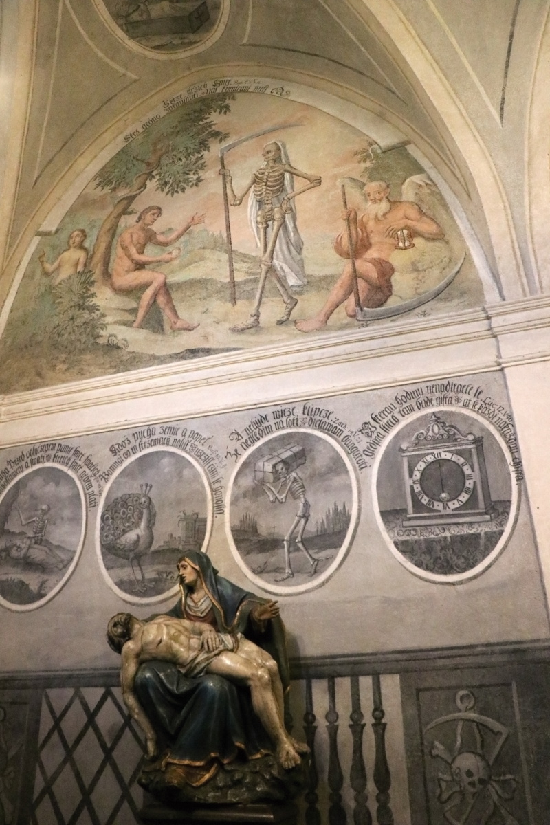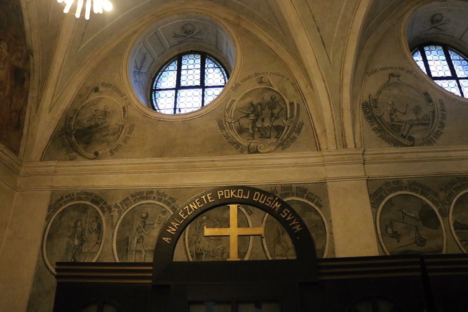 Jako by celá kaple rezonovala středověkým heslem Memento mori – pamatuj na smrt. Smrtka doprovází boháče, hudebníka, lékaře, měšťany a mnohé další. Nikdo se před ní neukryje, s každým se na konci jeho života setká. To připomínají i nápisy, které jsou součástí jednotlivých maleb. „Pod levým oknem uvidíme například hodovníka a smrtku doplněného nápisy: Jejich bohem a Ach mnohý pije. Smrt jej najde. Je to odkaz na svatého Apoštola Pavla v Listu k Filipanům. Jejich koncem je zahynutí, jejich bohem břicho a jejich chloubou to, zač by se měli stydět, neboť smýšlejí přízemně. Vedle pak vidíme Hrnčíře a smrtku s nápisem: Jako nádobu hrnčíře roztlučeš je a Sláva jest ta. Nádoba z bláta a odkazuje na Janovu Apokalypsu: Bude je pást železnou berlou, jako hliněné nádobí je bude rozbíjet. Pod pravým oknem vlevo je zase smrtka s náčiním lukostřelce s nápisy: Počet měsíců u tebe jest a Vždy skryta je hodina ta. Ach bděj duše! Buď hotova. Odkazuje nás na knihu Jobovu, kde se praví: Jestliže jsou stanoveny jeho dni, počet jeho měsíců je v mé moci, nepřekročí cíl, jenž jsi mu vytkl," vyjmenovává některé obrázků s nápisy Ladislav Harvánek.