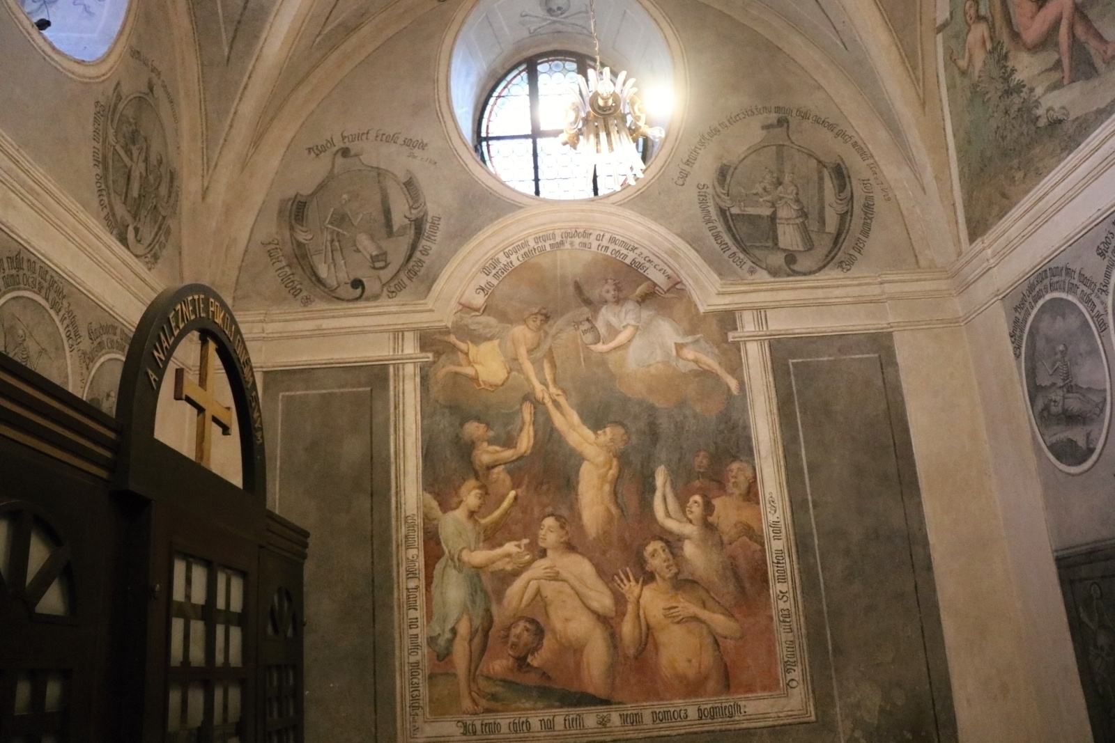 Výzdoba kaple poukazuje na lidské hříchy. Pět nástěnných fresek nese název Prvotní hřích, Poslední soud, Nebe, Očistec a Peklo. „Nebývá zvykem zobrazovat peklo v Božím příbytku, ale má být varováním pro ty, kteří žijí životem nezřízeným, sobeckým a nejsou ochotni pomáhat potřebným. Proto sem přicházejí nenapravitelní hříšníci, kteří nedostanou příležitost své skutky napravit. Ty jsou zapsány v knize života a oni jsou podle nich souzeni. Nakonec i nápis na fresce tyto hříšníky charakterizuje: Umřel boháč a pohřben jest v pekle," popisuje Ladislav Harvánek.