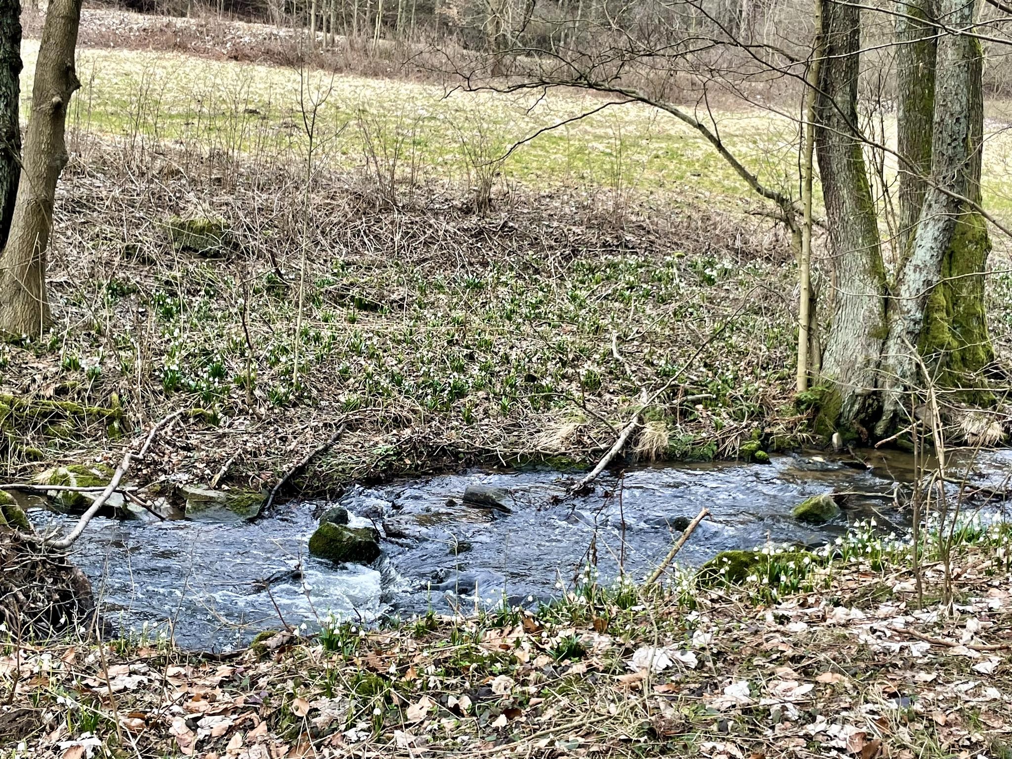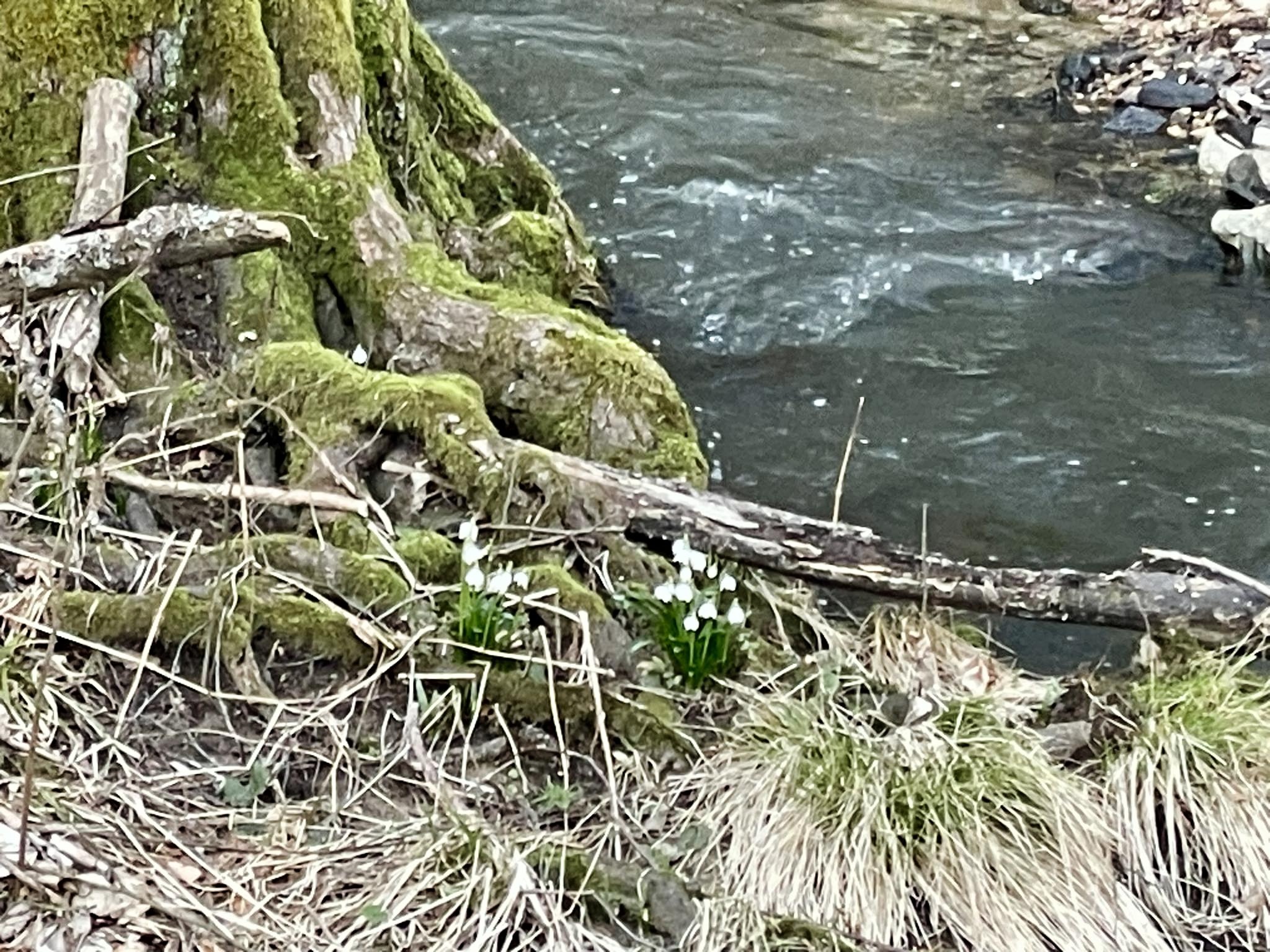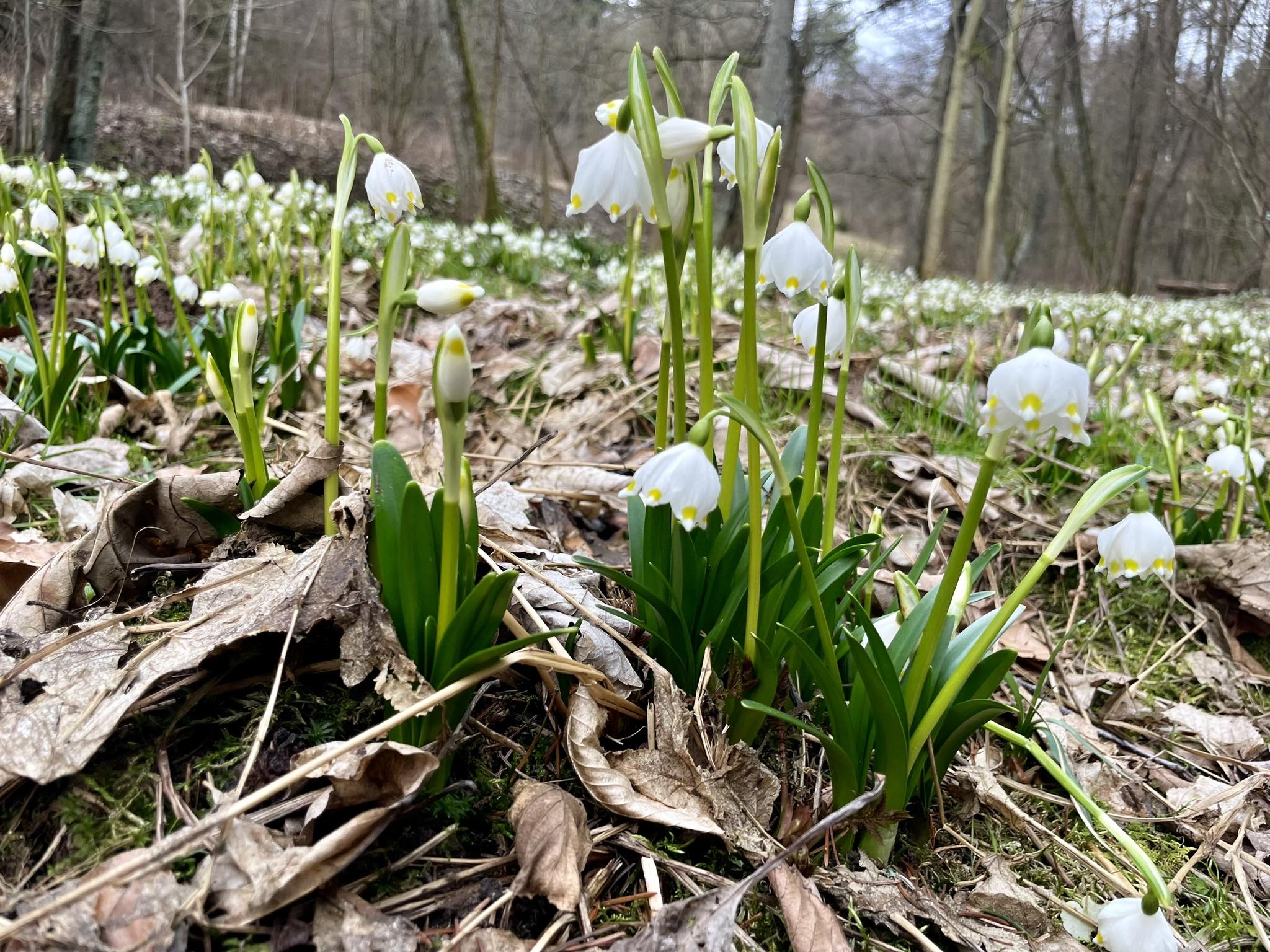 Přestože kalendář hlásí stále ještě zimu, v údolí Chlébského potoka už jaro vystrkuje drápky. Bledule jarní se roztahují nejen podél břehů tekoucí vody, ale také v širokém okolí.