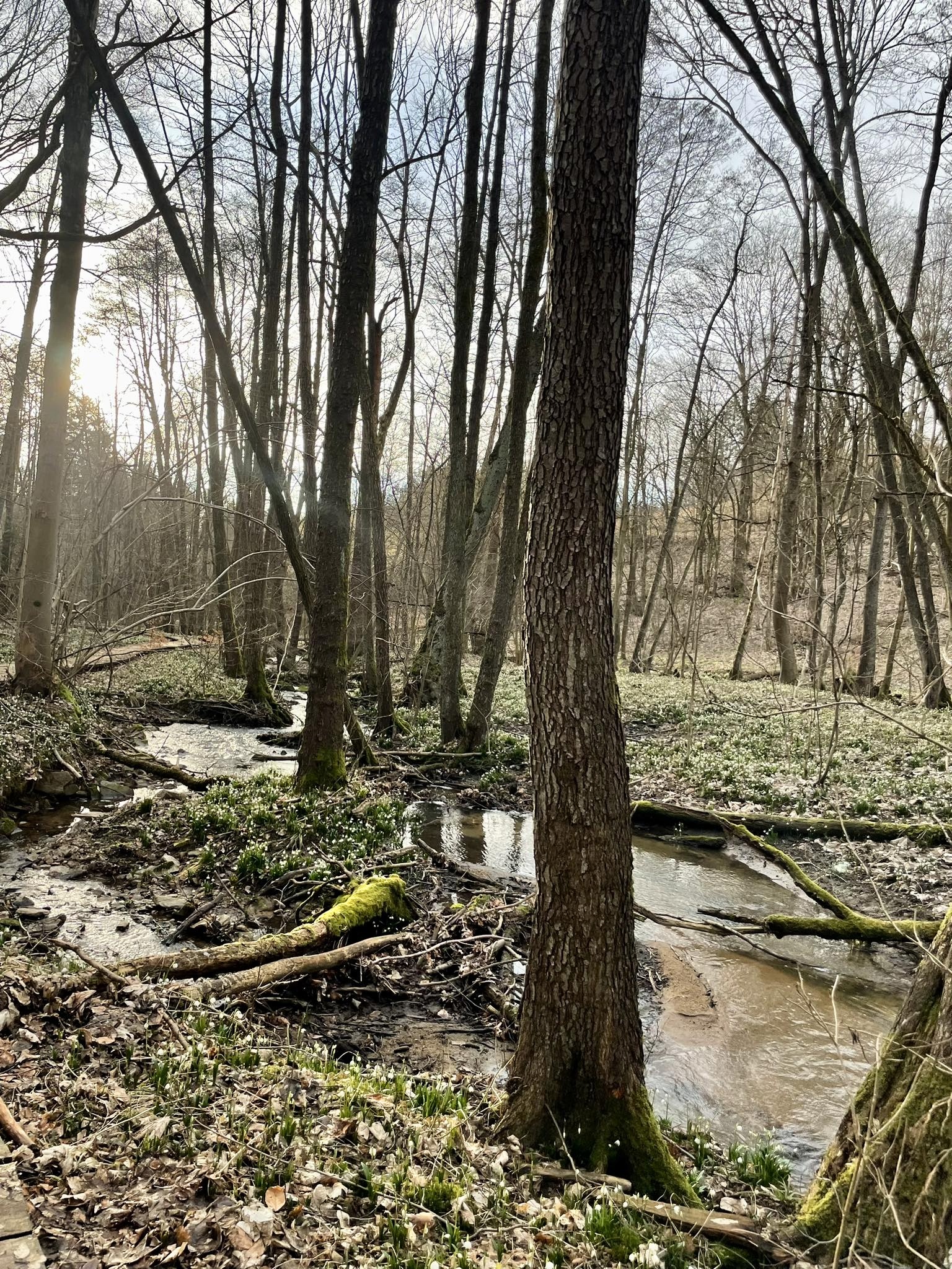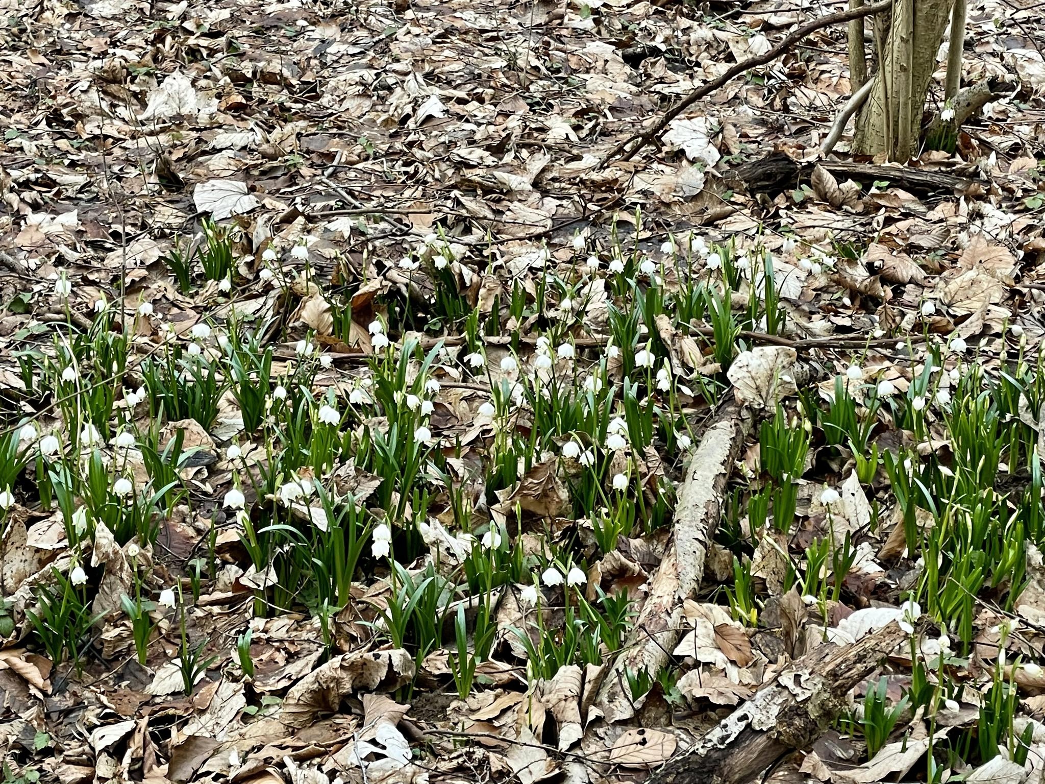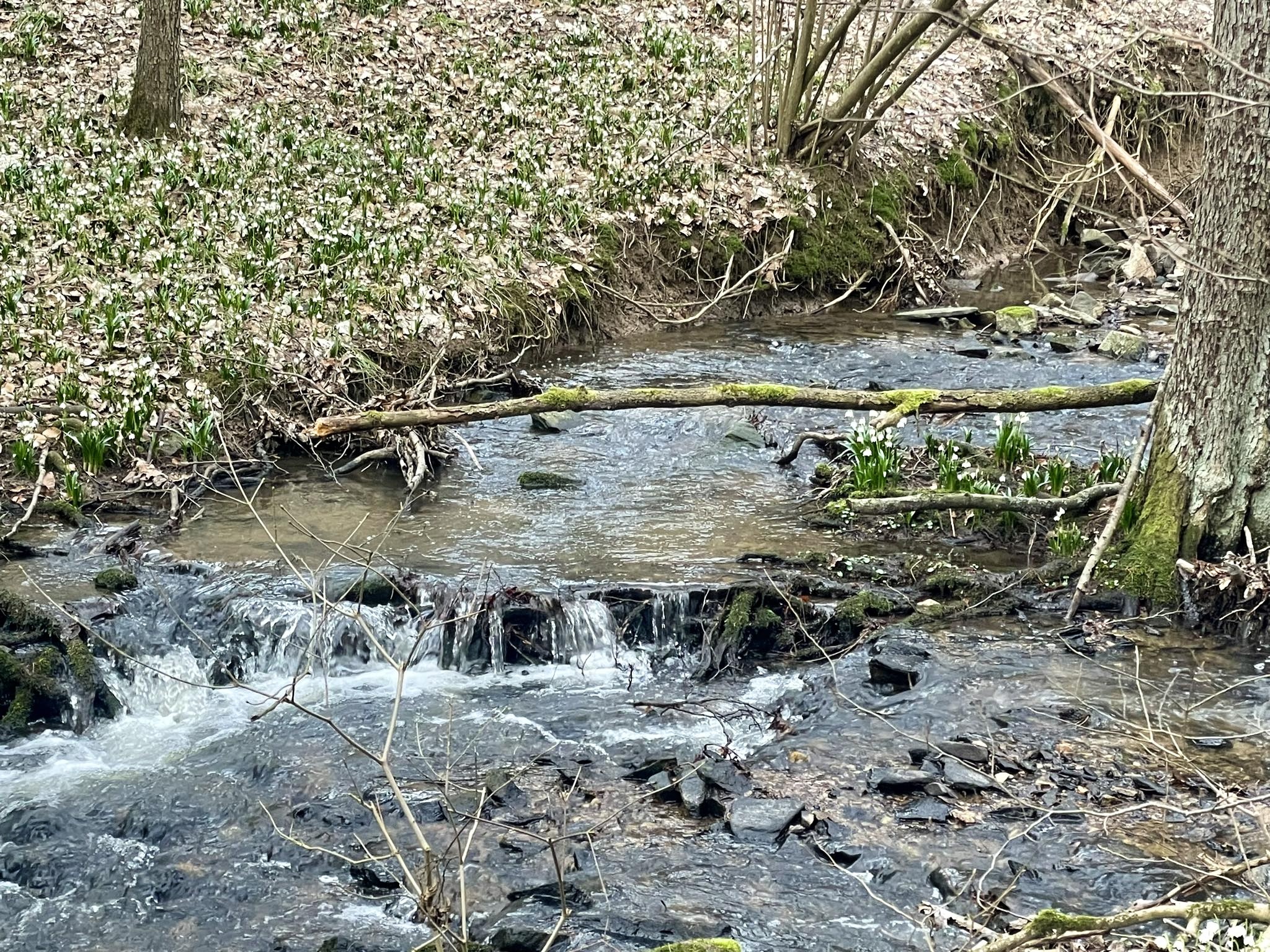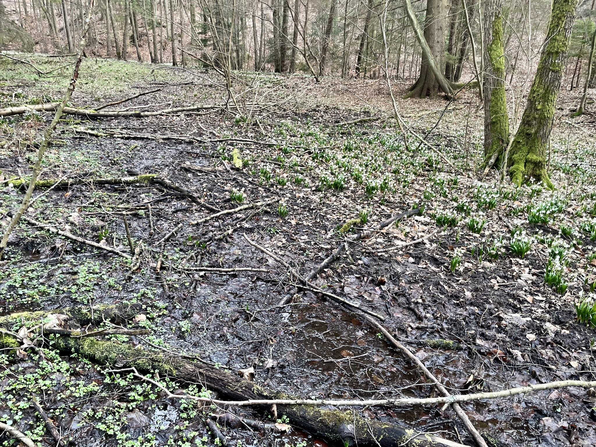 Přestože kalendář hlásí stále ještě zimu, v údolí Chlébského potoka už jaro vystrkuje drápky. Bledule jarní se roztahují nejen podél břehů tekoucí vody, ale také v širokém okolí.