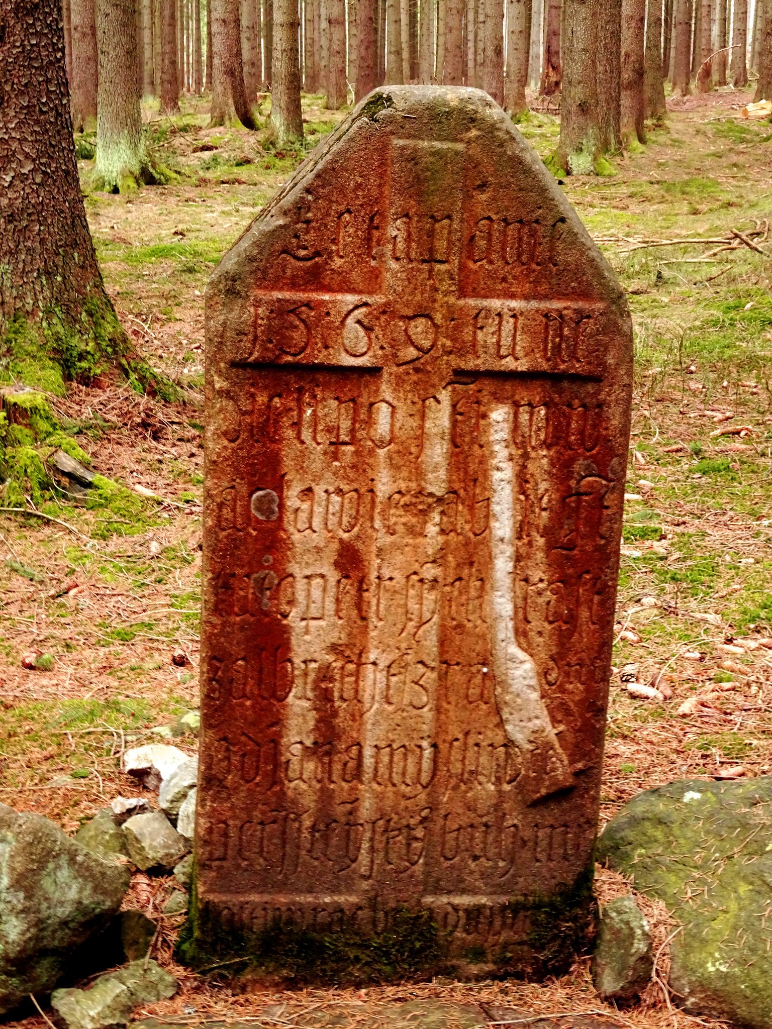 Druhý smírčí kámen, který si letos koncem srpna nějaký nenechavec odvezl z lesa, byl opravdu výstavní. Vysoký více než metr s vytesanými reliéfy kříže a pušky a nápisem: „Lieta Panie 1569 tu neděli po sv. Václavě zabit jest tuto Petr, syn Chrásty z Albrechtic, radní, od Jana, myslivce pernštejnského. Bůh milostiv rač býti duši jeho."