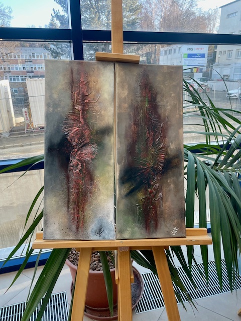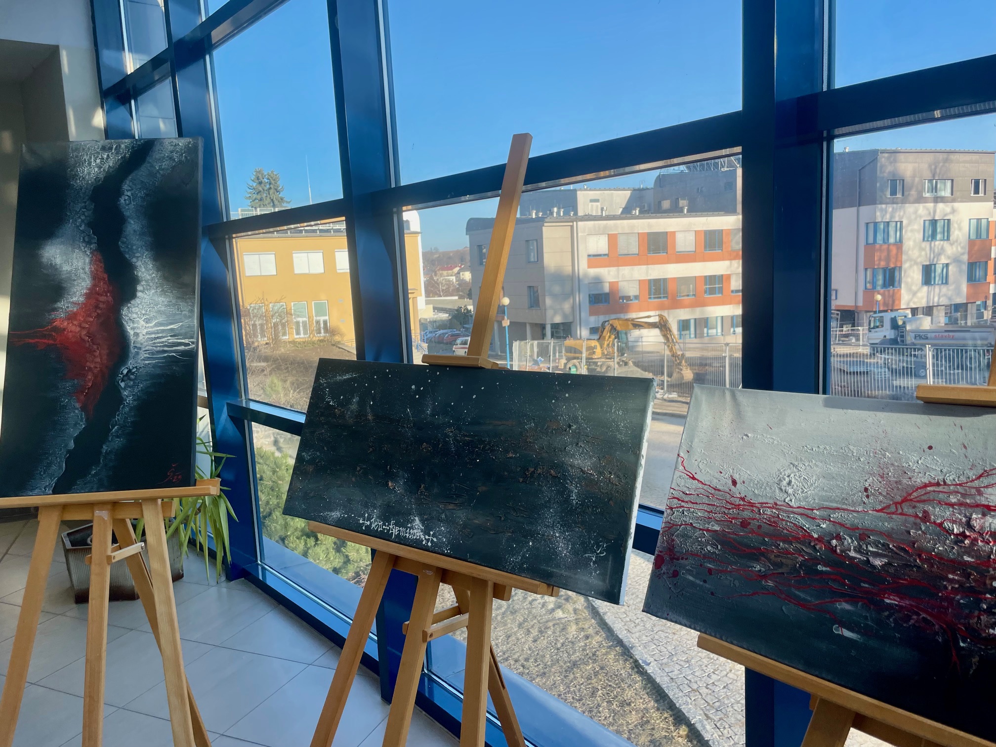 Obrazy Jiřího Havlíka jsou malované akrylem, Zlata Švandová si zase ráda pohraje s kombinovanou technikou.