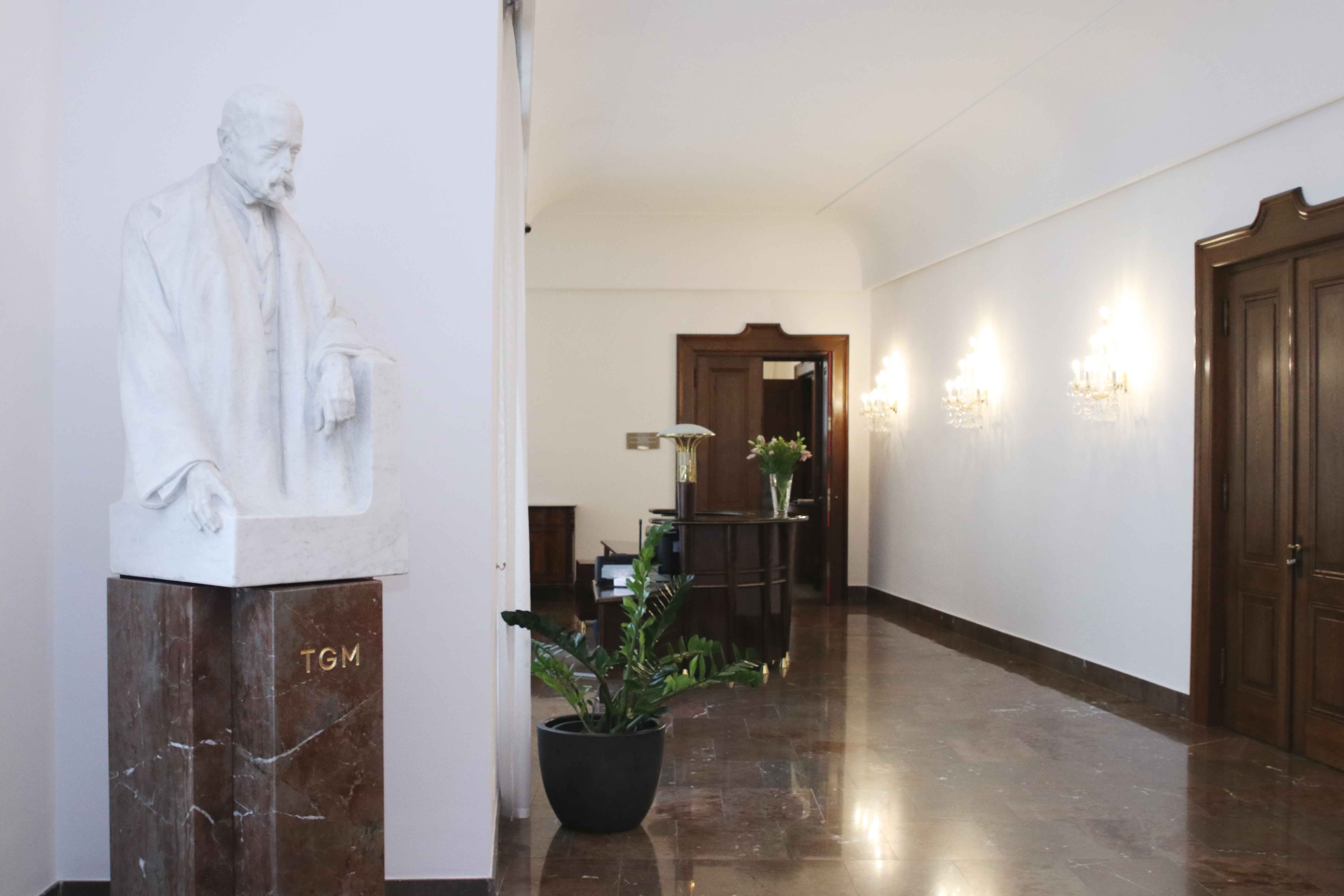 Busta, autor Jan Štursa. Byla pořízena z podnětu Štursova rodného města k desátému výročí vzniku republiky. Jde o odlitek z polopostavy, která byla v období první republiky dominantou jednacího sálu Poslanecké sněmovny Národního shromáždění v Rudolfinu. Od války došlo již k třetí reinstalaci busty. T. G. Masaryk byl jmenován čestným občanem města, které navštívil v roce 1906 a 1928.